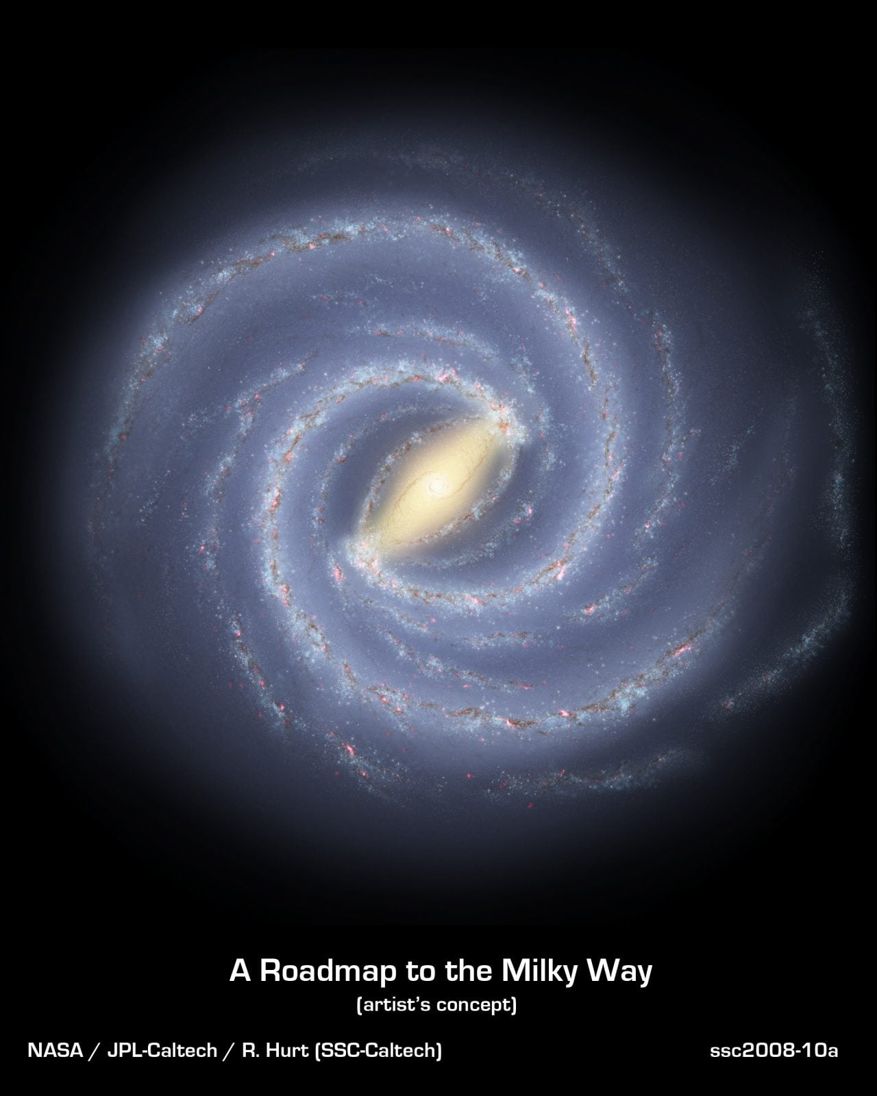 W końcu należy także wspomnieć o strukturze spiralnej. Choć większość wizualizacji przedstawiających budowę Drogi Mlecznej wygląda bardzo podobnie, wśród naukowców wciąż panuje duży sceptycyzm co do tego, jak naprawdę wygląda struktura naszej galaktyki. Dotychczasowe badania oraz modele opisujące budowę naszej galaktyki wskazują, że dysk składa się z czterech ramion wychodzących ze zgrubienia centralnego i zawijających się zgodnie z kierunkiem rotacji. Skąd się biorą ramiona? Badacze zakładają, że jest to po prostu fala gęstości w dysku gwiazdowym powstała np. w momencie bliskiego przelotu innej galaktyki, czy też efekt zaburzenia powstałego w dysku wskutek powstania „zatoru/korka” utworzonego przez gwiazdy.