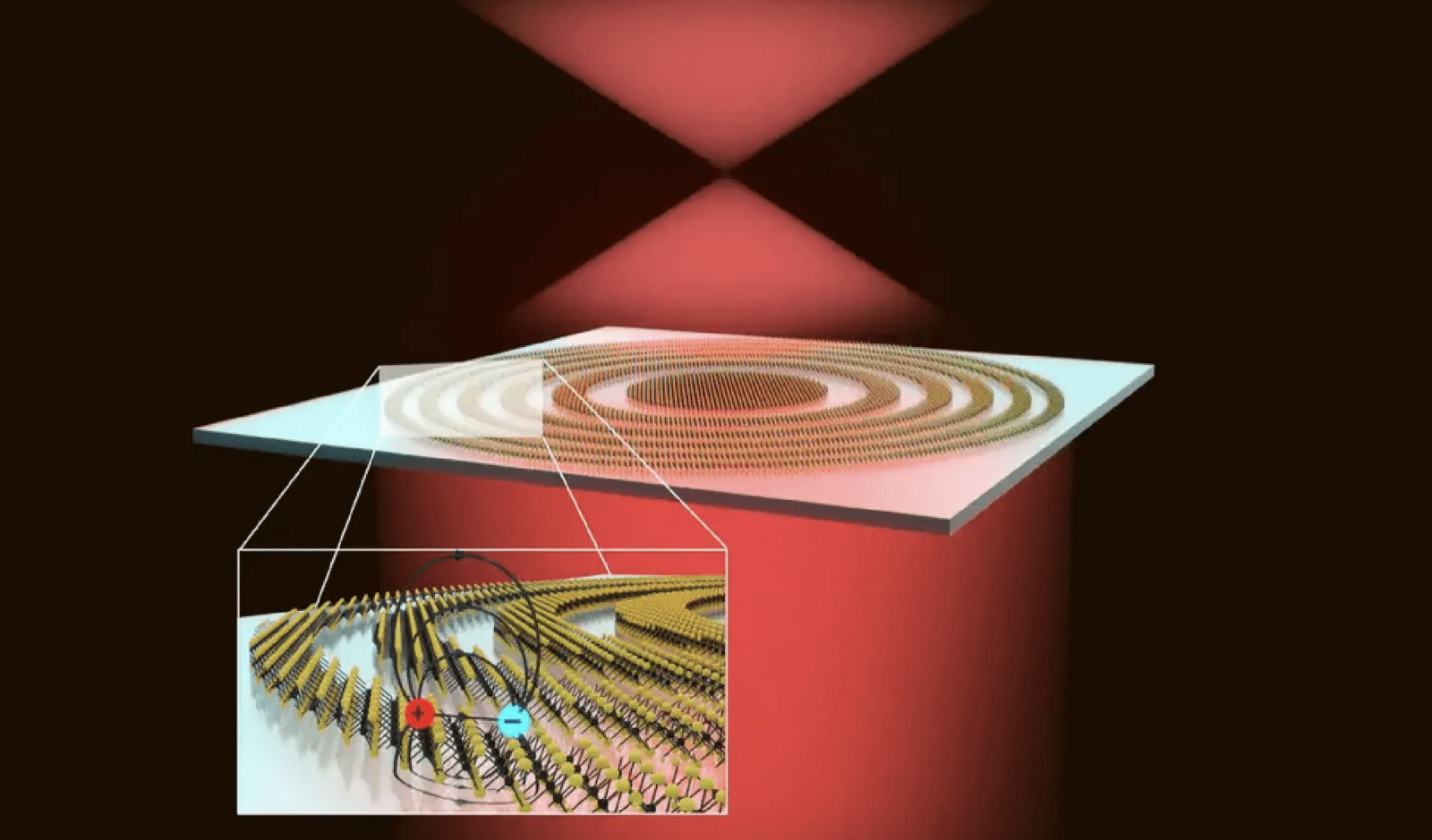 Zamiast polegać na zakrzywionej powierzchni, soczewka jest wykonana z koncentrycznych pierścieni WS2 z przerwami pomiędzy nimi (tzw. soczewka Fresnela) i skupia światło za pomocą dyfrakcji, a nie refrakcji. Rozmiar i odległość między pierścieniami (w porównaniu do długości fali światła padającego na nie) określają ogniskową soczewki. Zastosowana tutaj konstrukcja skupia czerwone światło 1 mm od soczewki.