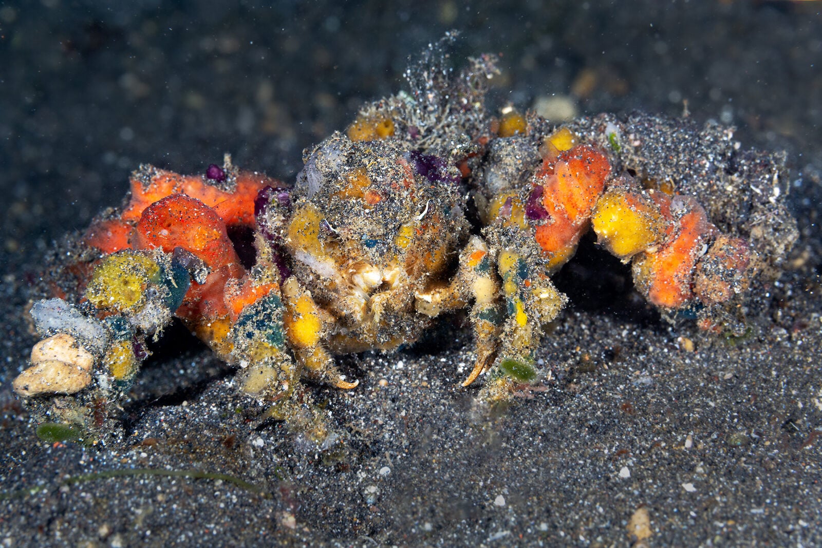 Camposcia retusa to krab, który aktywnie buduje swój kamuflaż. Przyczepia do pancerza fragmenty glonów, gąbek i koralowców, dopasowując je do aktualnego środowiska. Jego pancerz pokryty jest haczykowatymi strukturami, które umożliwiają “montaż” takiego modułowego kamuflażu.