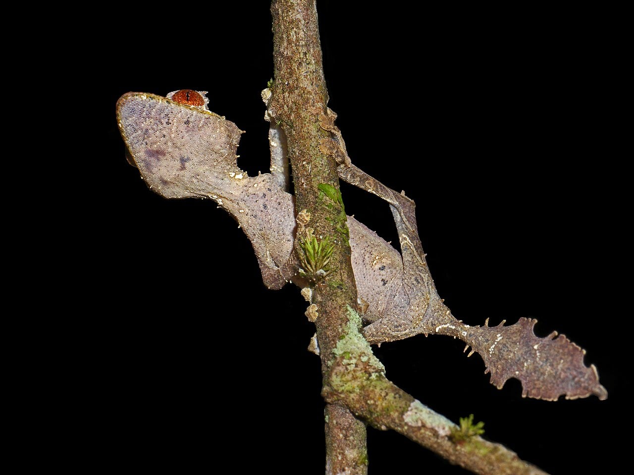 Ten niewielki gad z Madagaskaru wygląda jak martwy, nadgryziony liść – i dokładnie o to chodzi. Jego ciało ma nieregularne krawędzie, “dziury”, asymetrię i barwy odpowiadające różnym stadiów rozkładu liści. Nawet ogon przypomina oderwany fragment rośliny, a nie anatomiczną końcówkę ciała.