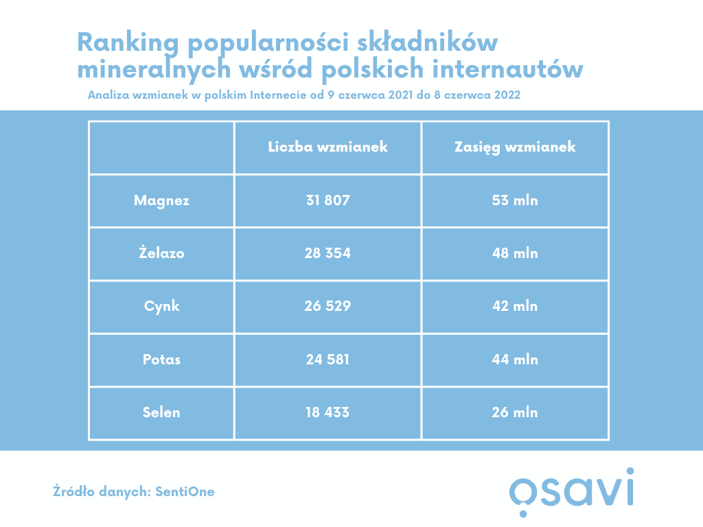 Analitycy Osavi wykorzystując sztuczną inteligencję SentiOne stworzyli ranking popularności składników mineralnych. Niekwestionowany numer jeden to magnez – w ciągu ostatnich 12 miesięcy internauci rozmawiali o nim ponad 31 000 razy, a wzmianki o nim miały 53 mln zasięgu. Na drugim miejscu uplasowało się żelazo, które wspominano 28 000 razy, z zasięgiem na poziomie 48 mln. Na podium znalazło się także miejsce dla cynku z 26 000 wypowiedzi i zasięgiem na 42 mln.