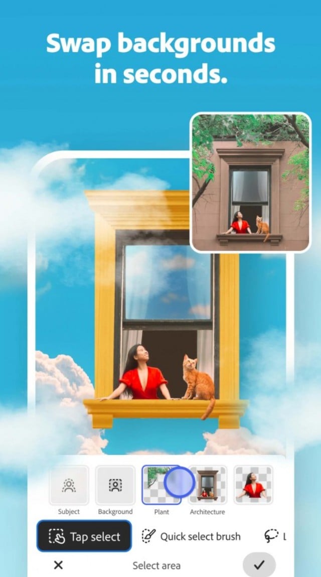 - Szybkie usuwanie lub zastępowanie części obrazu za pomocą intuicyjnego narzędzia Tap Select.