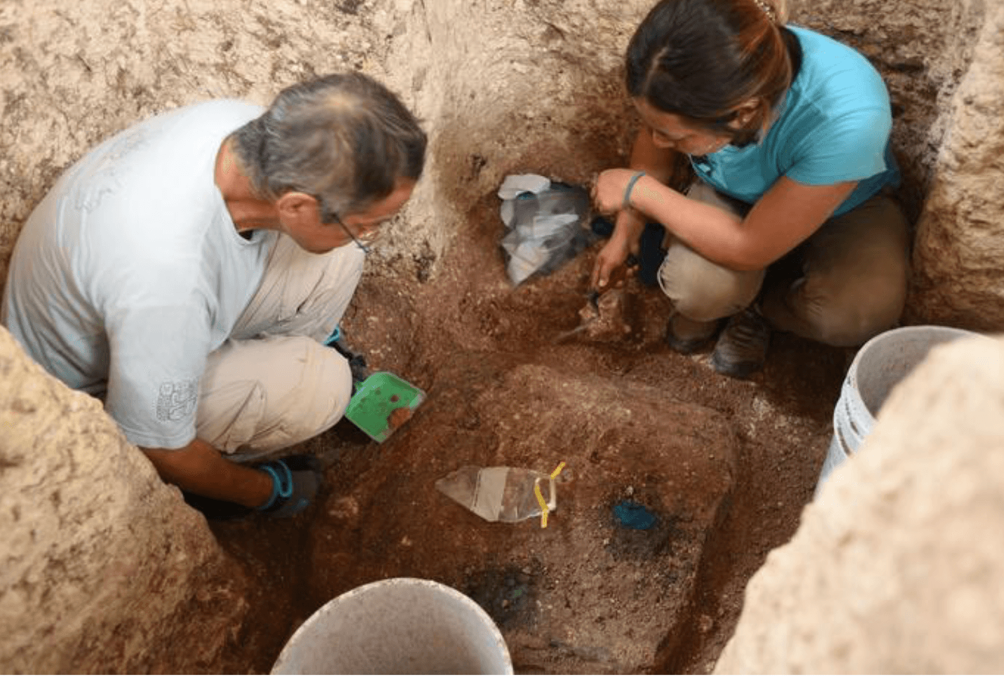 W tych samych zagłębieniach odnaleziono ofiary z muszli oraz rzeźbione przedmioty z jadeitu i zielonego kamienia. Wśród znalezisk znalazły się wizerunki krokodyli, ptaków oraz figurka prawdopodobnie przedstawiająca kobietę podczas porodu – wszystkie ułożone w kształt krzyża. Datowanie radiowęglowe wskazuje na okres między 900 a 845 r. p.n.e. Muszle umieszczone po bokach mogły symbolizować wodę, która w kosmologii Majów odgrywała kluczową rolę.