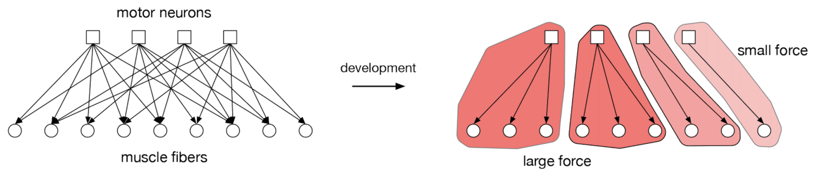 U dorosłych zwierząt każde z włókien mięśniowych ciała jest sparowane z dokładnie jednym neuronem, który kontroluje jego ruch. Jednak na wczesnym etapie życia każde włókno jest celem wielu neuronów. Aby zwierzę poruszało się wydajnie, należy przyciąć nadmiarowe połączenia (tzw. przycinanie rozwojowe). Jak organizm tego dokonuje?