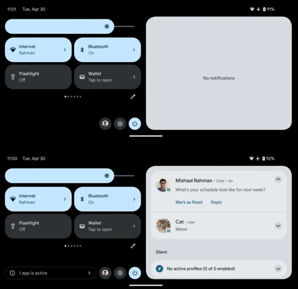 Jak pokazuje nam serwis Android Authority, Android 15 wprowadzi tu spore zmiany, bo jak możecie zobaczyć poniżej, po rozwinięciu mamy ekran podzielony na powiadomienia i cztery kafelki szybkich ustawień w układzie 2×2, suwak jasności, skrót do ustawień czy przycisk zasilania. Jest to tak naprawdę zmniejszona wersja panelu powiadomień z tabletów, ale najważniejsze, że wygląda to na dużo bardziej funkcjonalne rozwiązanie.