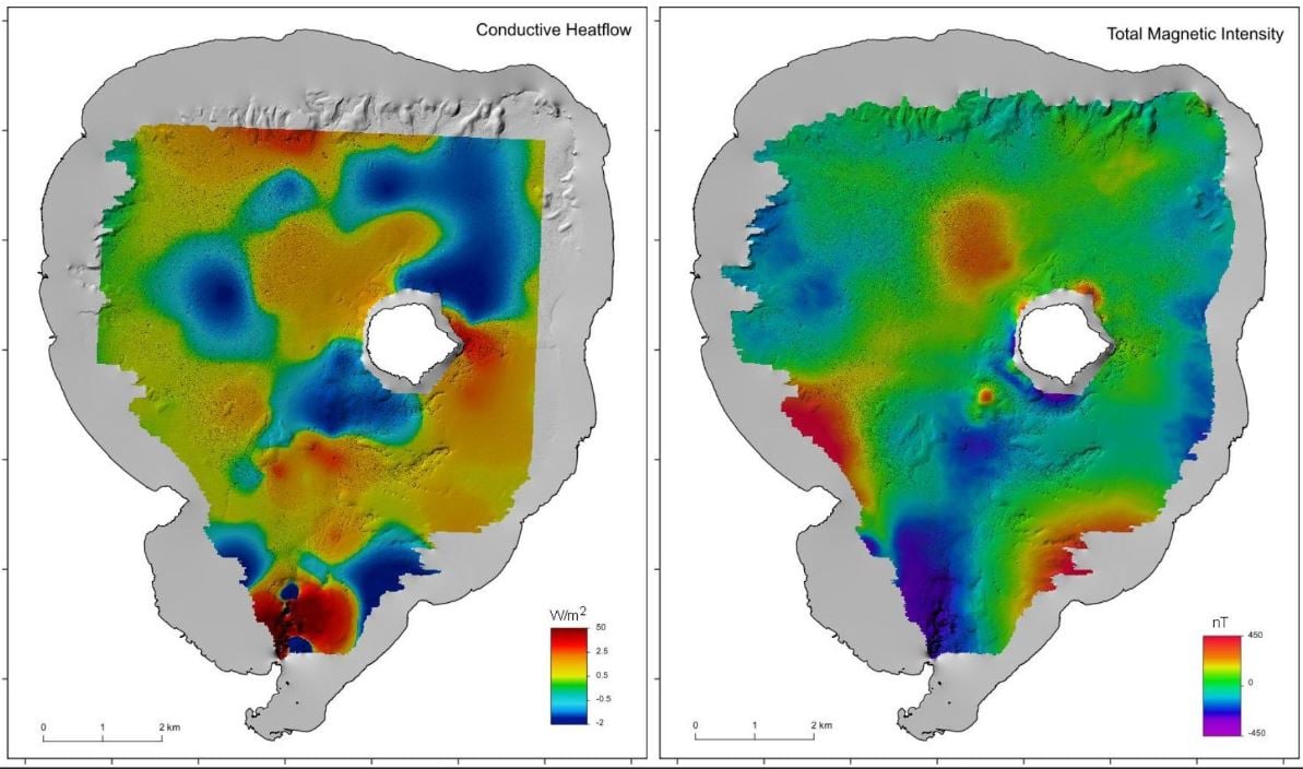 Na innej mapie ukazującej przepływ ciepła zauważamy wyraźny wzrost właśnie w tej okolicy, gdzie zanikają właściwości magnetyczne. Zatem nie mamy wątpliwości, że południe Rotorua jest aktywnym systemem hydrotermalnym. Niewykluczone, że może on być połączony z lądowym system w okolicach miasta Rotorua. To nam ukazuje, jak złożona jest budowa geologiczna nowozelandzkiej Wyspy Północnej.
