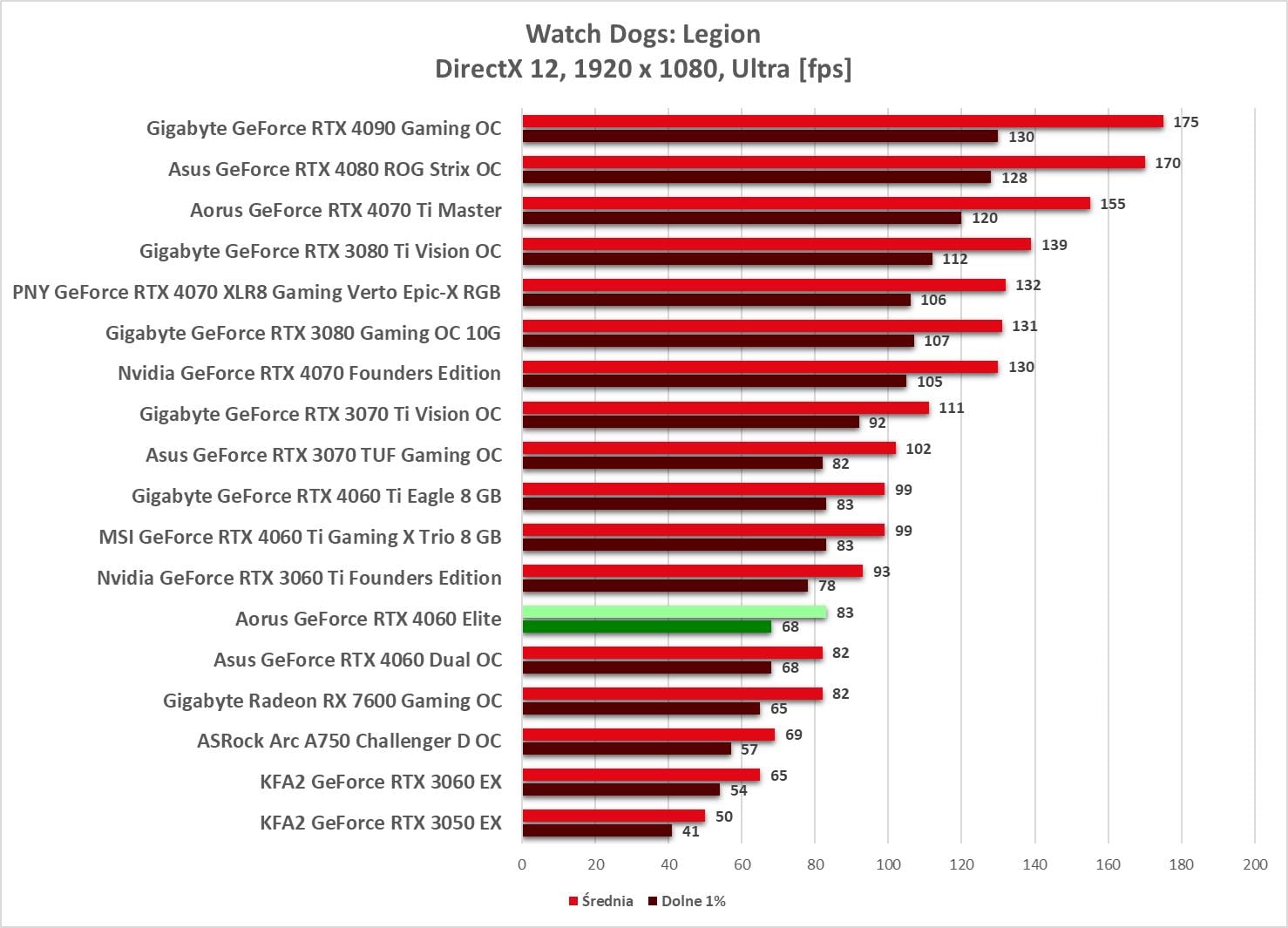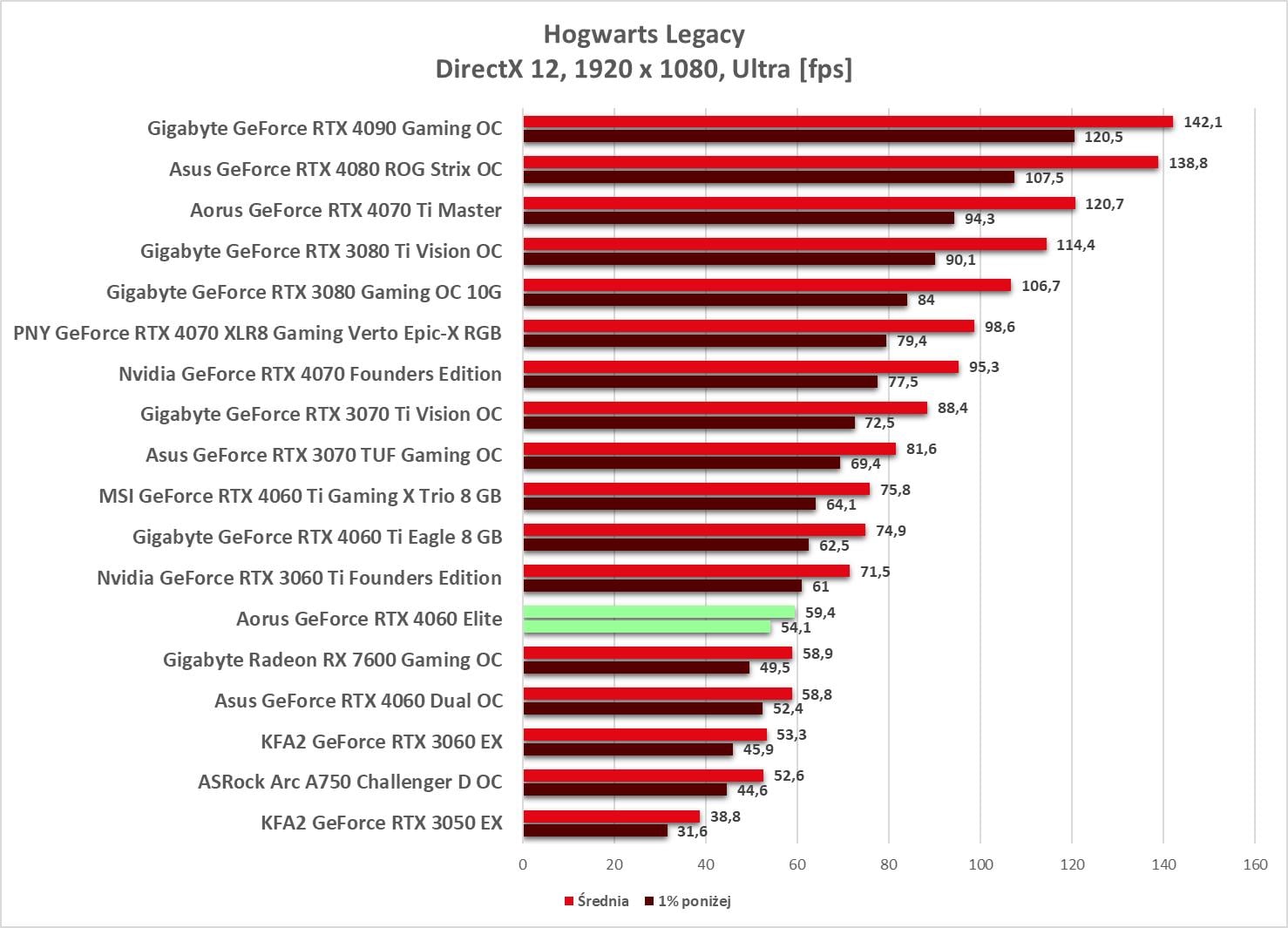 RTX 4060 został stworzony do rozgrywki w 1920 x 1080. Mamy jednak 3 gry bez średnio 60 fps, choć w Hogwarts Legacy minimalnie do tej wartości brakuje.