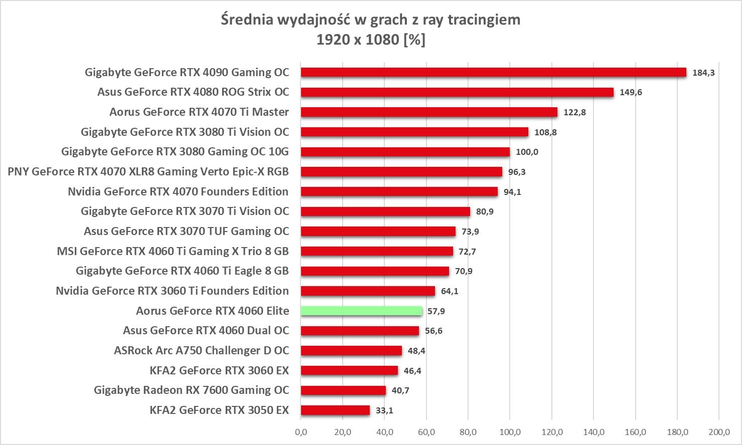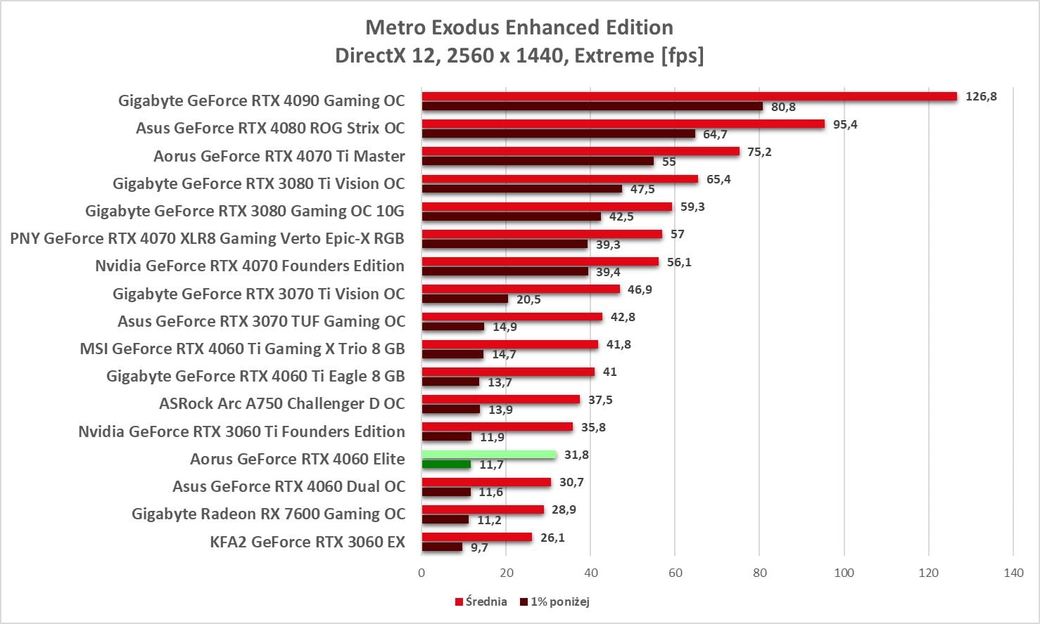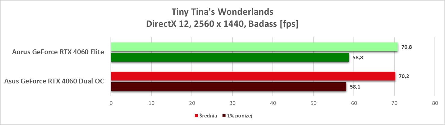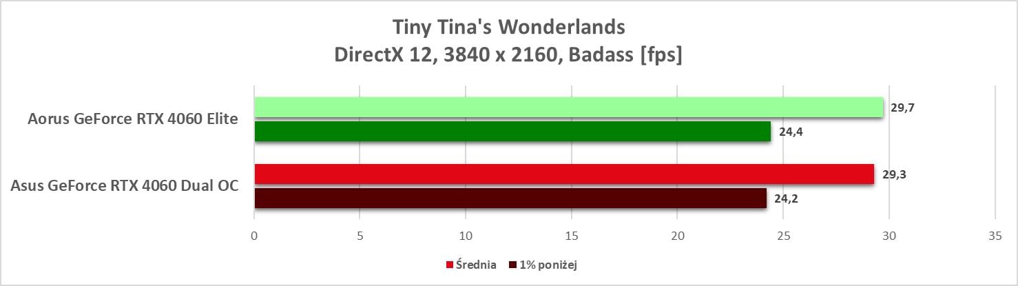 Przy rasteryzacji nie ma zaskoczenia. Model Aorusa wypada lepiej od wersji Asusa, ale nadal przegrywa z RTX 3060 Ti. Widać więc przewagę nad RTX 3060, ale nie jest ona tym, czego byśmy oczekiwali po następcy. Sama wydajność w 3840 x 2160, która jest bliska RTX 3060 jest też trochę niepoważna. A sytuacja jest jeszcze gorsza jak zobaczycie, że jest jedna gra (Tiny Tina’s), w której grafika wypada słabiej od RTX 3060 w najwyższej rozdzielczości.