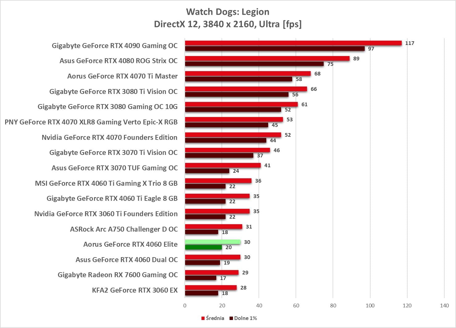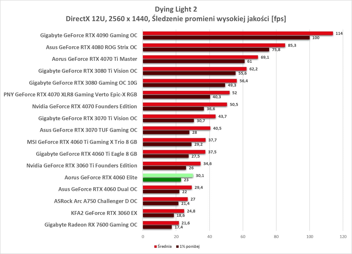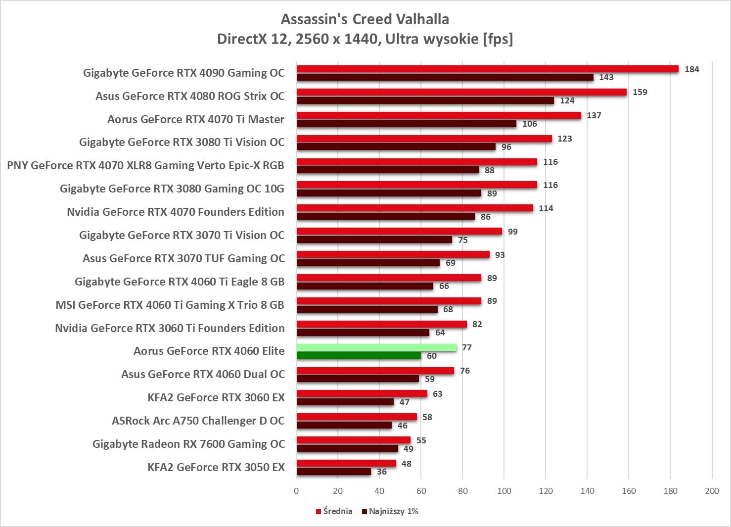 Przy rasteryzacji nie ma zaskoczenia. Model Aorusa wypada lepiej od wersji Asusa, ale nadal przegrywa z RTX 3060 Ti. Widać więc przewagę nad RTX 3060, ale nie jest ona tym, czego byśmy oczekiwali po następcy. Sama wydajność w 3840 x 2160, która jest bliska RTX 3060 jest też trochę niepoważna. A sytuacja jest jeszcze gorsza jak zobaczycie, że jest jedna gra (Tiny Tina’s), w której grafika wypada słabiej od RTX 3060 w najwyższej rozdzielczości.