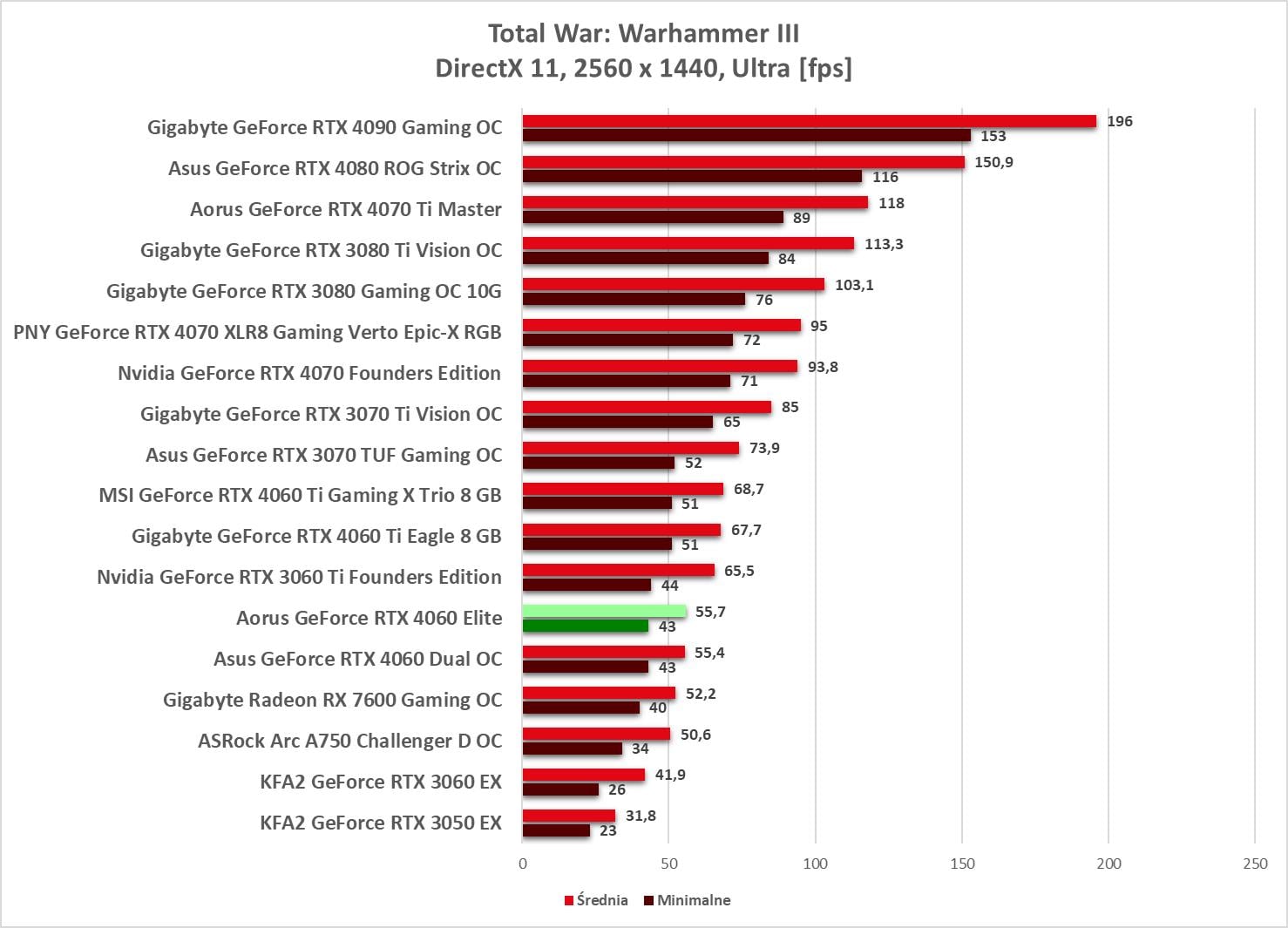 W kolejnej rozdzielczości sytuacja się odwraca i są tylko dwie gry ze średnio 60 fps. Widać więc, że powyżej 1920 x 1080 karta radzi sobie już słabiej.