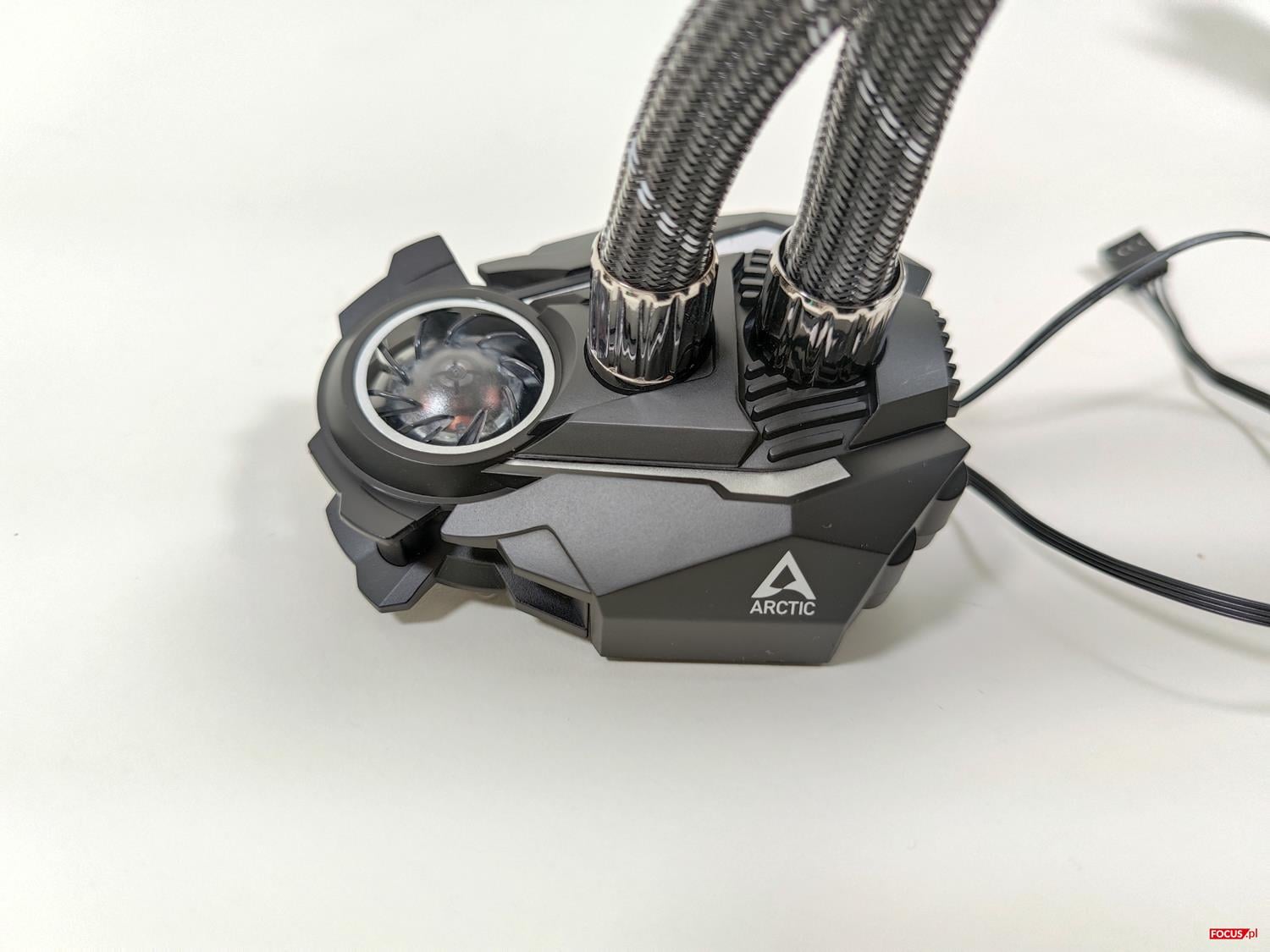 Wymiary blokopompki to 78 x 53 x 98 mm. Wychodzą z niej dwa kable: ARGB i 4-pin PWM. Po ich podłączeniu zasilane będą wszystkie wentylatory oraz podświetlenie. Jest to świetne rozwiązanie, które zdecydowanie pomaga w złożeniu zestawu i utrzymaniu porządku w okablowaniu. Blokopompka ma dodatkowy wentylator VRM o średnicy 40 mm. Jego maksymalna prędkość to 3000 RPM. Jego zadaniem jest schłodzenie sekcji zasilania, co też sprawdzimy w testach. Sama pompka pracuje z maksymalną prędkością równą 2000 RPM. Wadą tego wszystkiego jest fakt, że tak naprawdę blok można zamontować tylko w jednej orientacji.