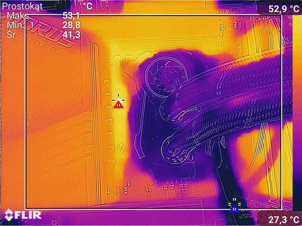 Czujnik na płycie pokazywał kolejno 53°C i 47°C. Różnica może nie jest zbyt duża, ale na pewno występuje. Wentylator VRM z pewnością więc pozwoli na obniżenie temperatur sekcji, choć nie będą to spektakularnie wysokie zmiany. Samo śmigło jest ciche i nawet przy maksymalnych obrotach pracuje z głośnością poniżej 36 dBA.
