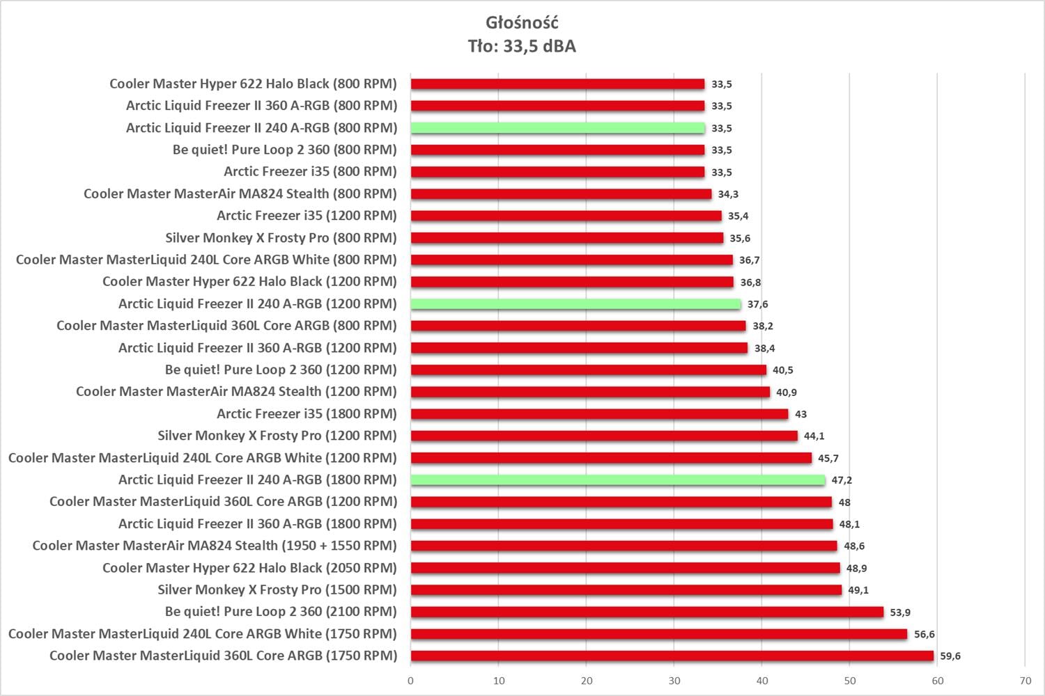AiO warto porównać do 240 mm konstrukcji od Cooler Mastera. Widać tutaj różnice pomiędzy dwoma konstrukcjami przy maksymalnych obrotach i 1200 RPM. Przy 800 RPM lekko wygrywa Arctic. Testowany produkt przegrywa też przy maksymalnych obrotach i 1200 RPM z najwydajniejszym chłodzeniem powietrzem od Cooler Master, choć przy 800 RPM ponownie mamy zmianę.