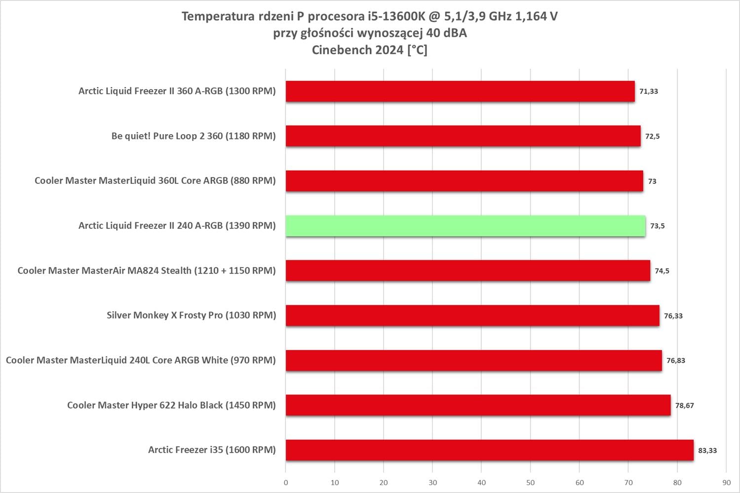 Przy normalizacji do 40 dBA wszystko się zmienia i Arctic Liquid Freezer II 240 A-RGB przegrywa tylko z AiO 360. Przewaga nad 240L Core jest też naprawdę spora, AiO wygrywa też z MA824 Stealth.