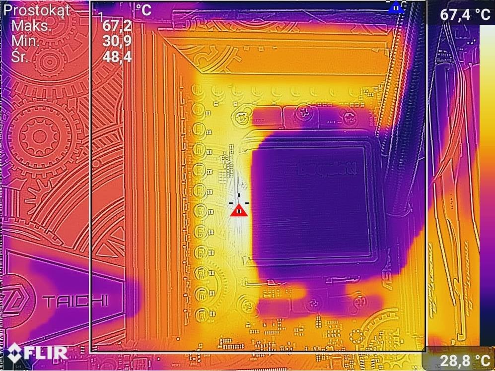 Czujnik na płycie pokazywał kolejno 64°C i 69°C. Wyniki są więc bardzo dobre i bez problemów możecie nawet podkręcać najmocniejszy procesor. Temperatura jest trochę większa niż w przypadku standardowego modelu, ale nie jest ona wysoka więc nie ma tutaj żadnych problemów.