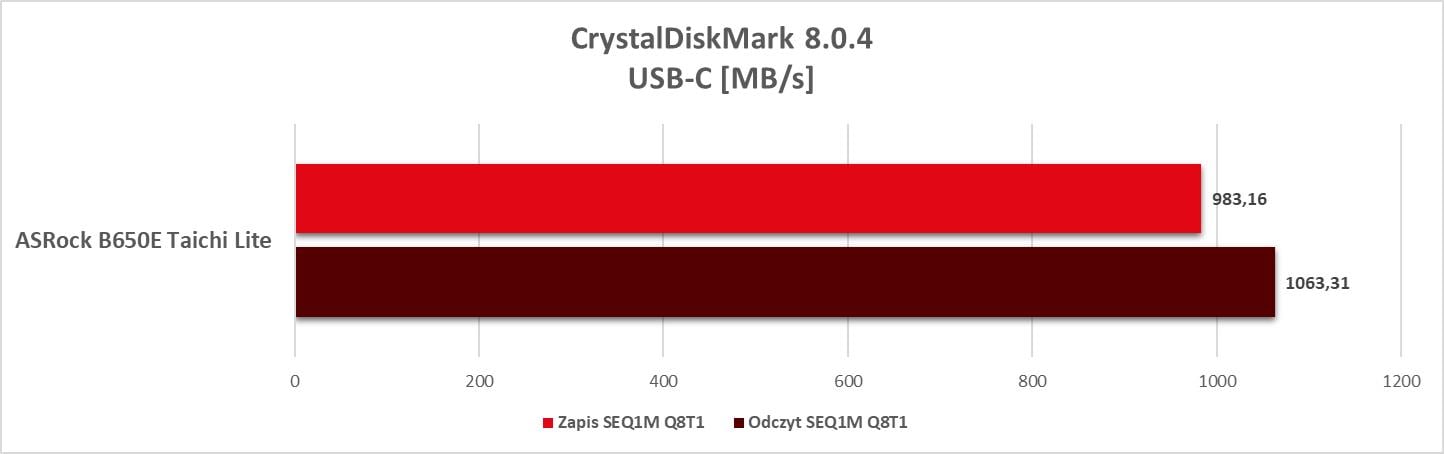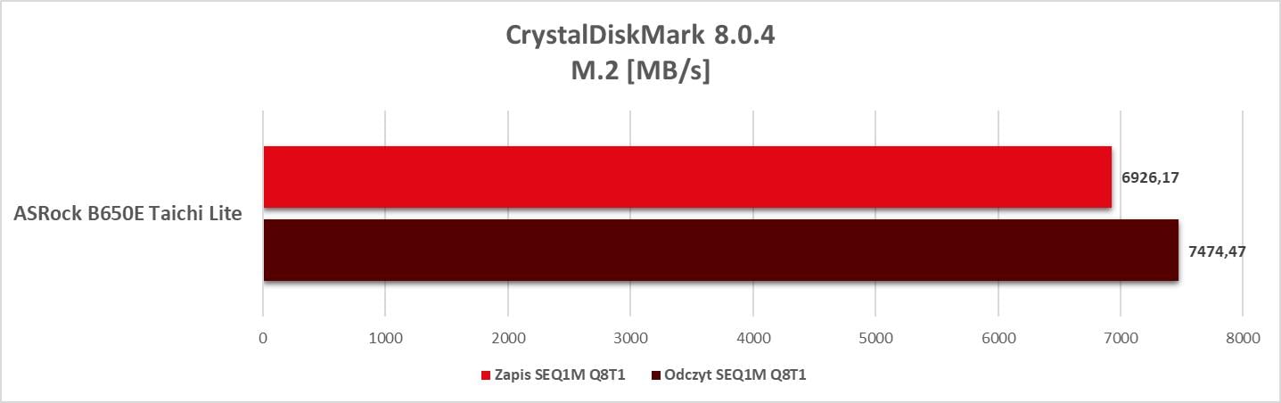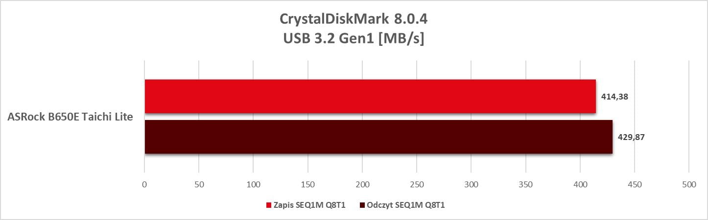 Płyta w niczym nie ogranicza podzespołów. Wyniki wydajności są bardzo dobre i jedynie odstają USB czy SATA podpięte pod kontrolery ASMedia. Poza tym możecie spokojnie budować najwydajniejszy zestaw oparty choćby o RTX 4090 i 7950X. Tutaj dodam jeszcze, że dysk umieszczony pod największym radiatorem przy obciążeniu CrystalDiskMark uzyskał temperatury 52°C i 64°C. Są to znakomite wyniki i widać, że radiator radzi sobie z dyskiem.