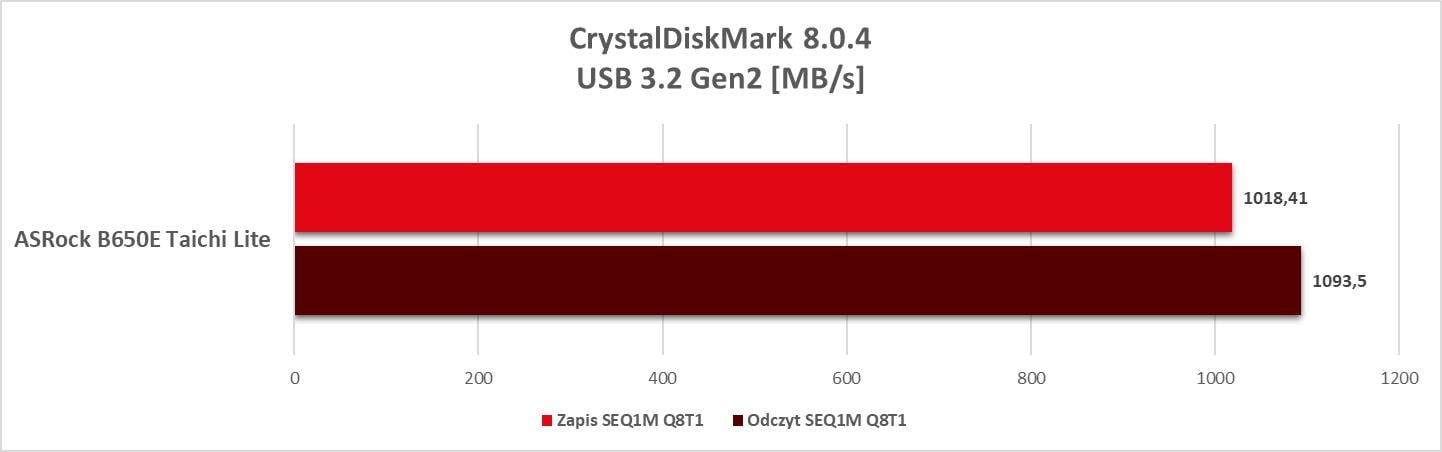 Testy wykonałem po włączeniu profilu EXPO pamięci. Pozostałe opcje pozostawiłem domyślne. Porty USB testowałem na dysku Adata SE800 1 TB, SATA na Adata SU650 120 GB, a M.2 na Samsung 990 Pro 2TB.