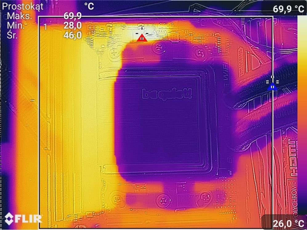Temperatura jest sporo niższa, niż w przypadku 7950X. Płyta spokojnie daje sobie radę z 7950X3D i możecie nawet taki procesor sparować z tą konstrukcją. Nawet przy obudowach ze słabszym przepływem powietrza nie powinno być problemów.