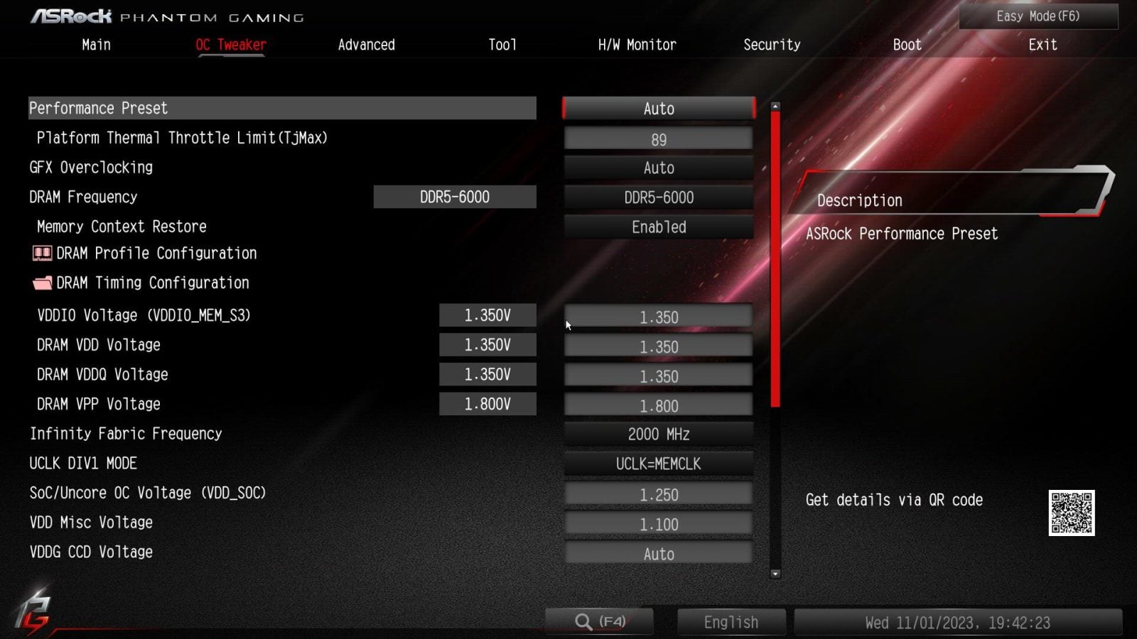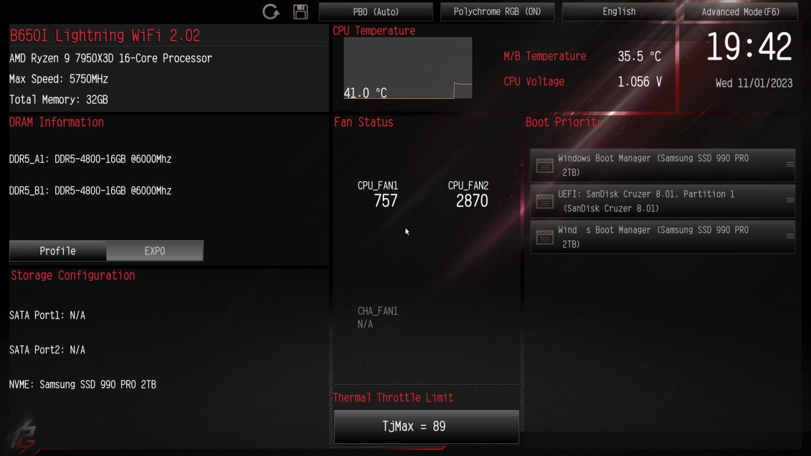 W trybie Easy mamy możliwość włączenia EXPO. Jest też jeszcze jedna ciekawa rzeczy – thermal throttle limit. Płyta domyślnie zakłada dla każdego procesora limit 75°C, co jest niską wartością. Warto tutaj ją przestawić zgodnie z Waszym modelem procesora. Jest to też trochę dziwne podejście, z którym pierwszy raz się spotykam. W trybie zaawansowanym jeśli procesor pozwala na OC to łatwo tego dokonacie. Łatwo też ustawicie wentylatory czy możecie zmienić podświetlenie. Większość opcji jest łatwa do znalezienia i nie ma z tym problemów.
