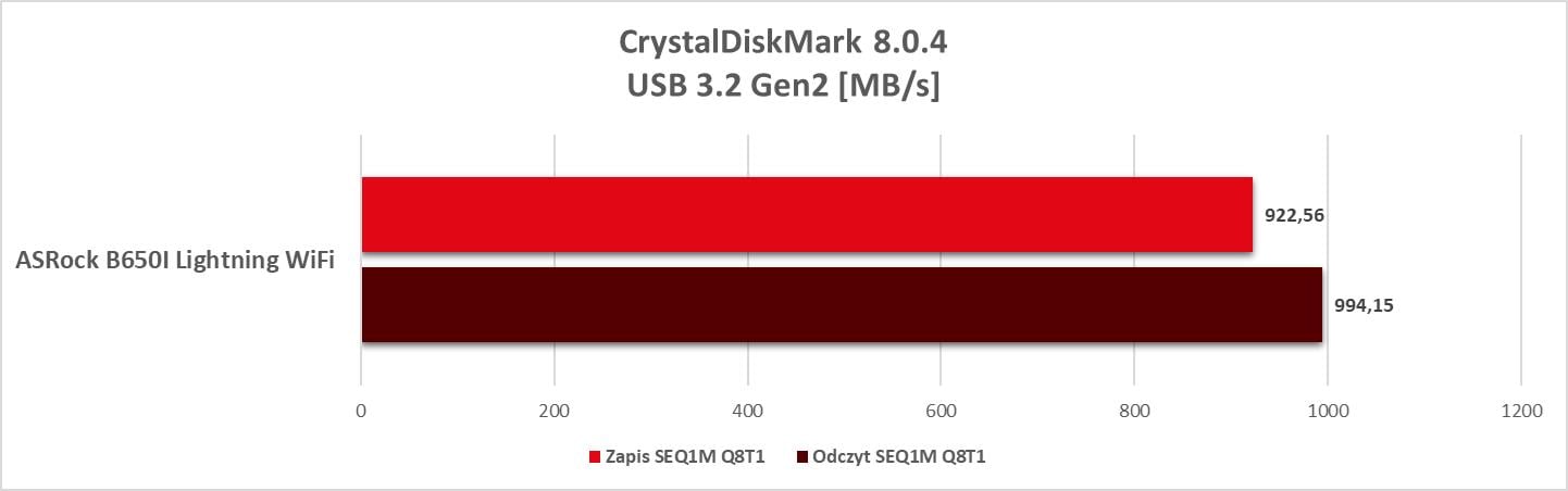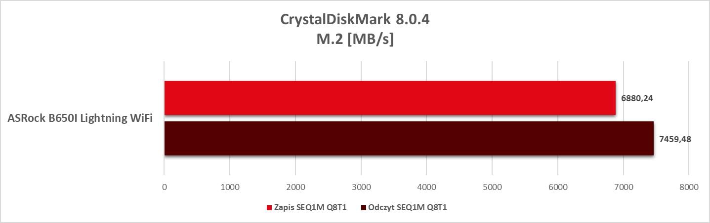 Wyniki są bardzo dobre i płyta w niczym nie ogranicza zastosowanych podzespołów. Spokojnie więc możecie połączyć 7950X3D z RTX 4080 (o ile znajdziecie na nią małą obudowę) i będziecie notowali naprawdę fajne wyniki. Dodam też, że dysk schowany pod radiatorem pod kartą graficzną uzyskał temperatury 54°C i 65°C pod obciążeniem CrystalDiskMark. To bardzo dobre wyniki i widać, że radiator daje radę.