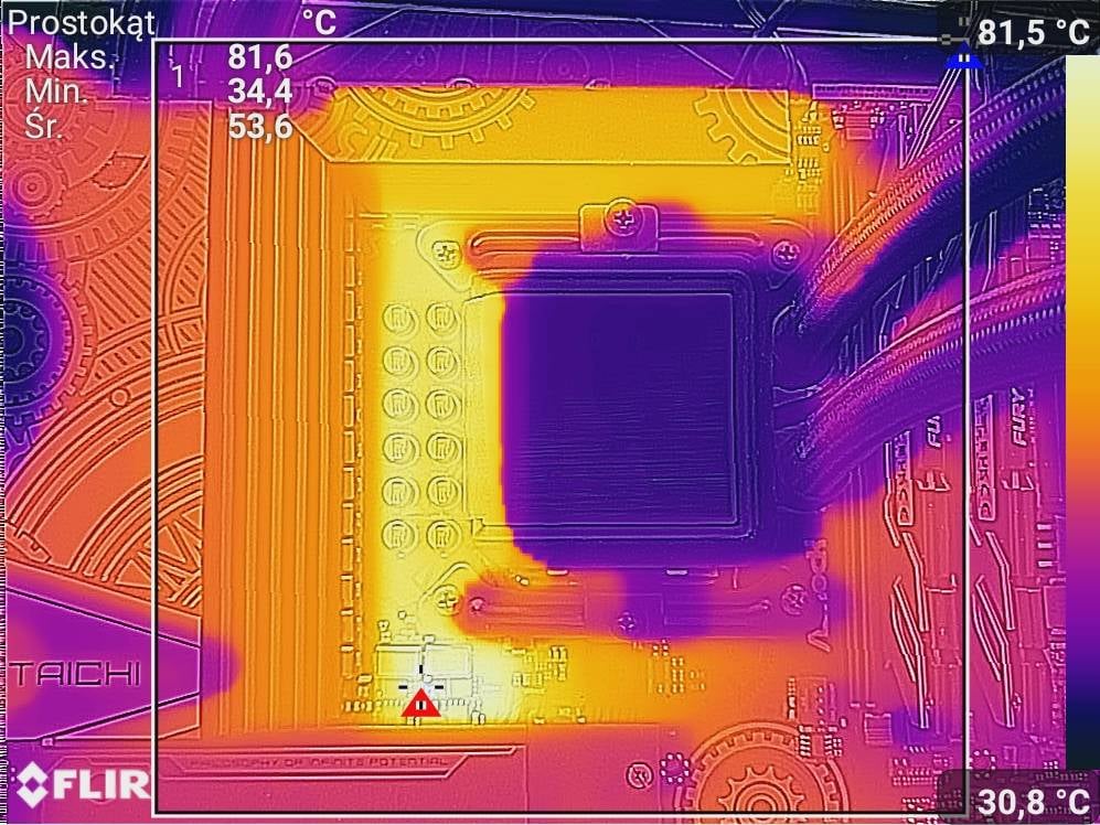 Czujnik na płycie pokazywał 84°C oraz 86°C. Wyniki są bliskie, bowiem OC udało się wykonać przy podobnym napięciu co płyta dawała bez OC. Temperatury są wysokie, ale w pełni bezpieczne. W obudowie z dobrym przepływem powietrza będą one jeszcze niższe. Tutaj jednak widać spore różnice w stosunku do Taichi, który miał lepiej chłodzoną sekcję.