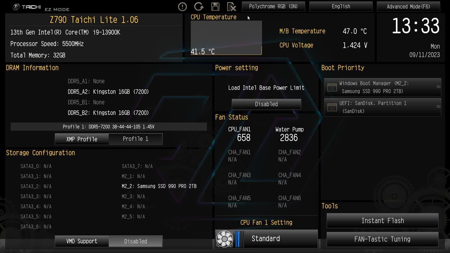 BIOS jest typowy dla ASRock. Mamy tryb Easy gdzie łatwo ustawimy profil XMP czy zmienimy działanie wentylatorów. W trybie zaawansowanym możemy podkręcić procesor czy pamięci RAM – opcji jest naprawdę sporo. Łatwo też zmienicie krzywe obrotów czy dla danego złącza włączycie tryb pracy dla pompki. Limity mocy procesora są domyślnie zdjęte. Całość niczym więc nie odbiega od innych płyt producenta.