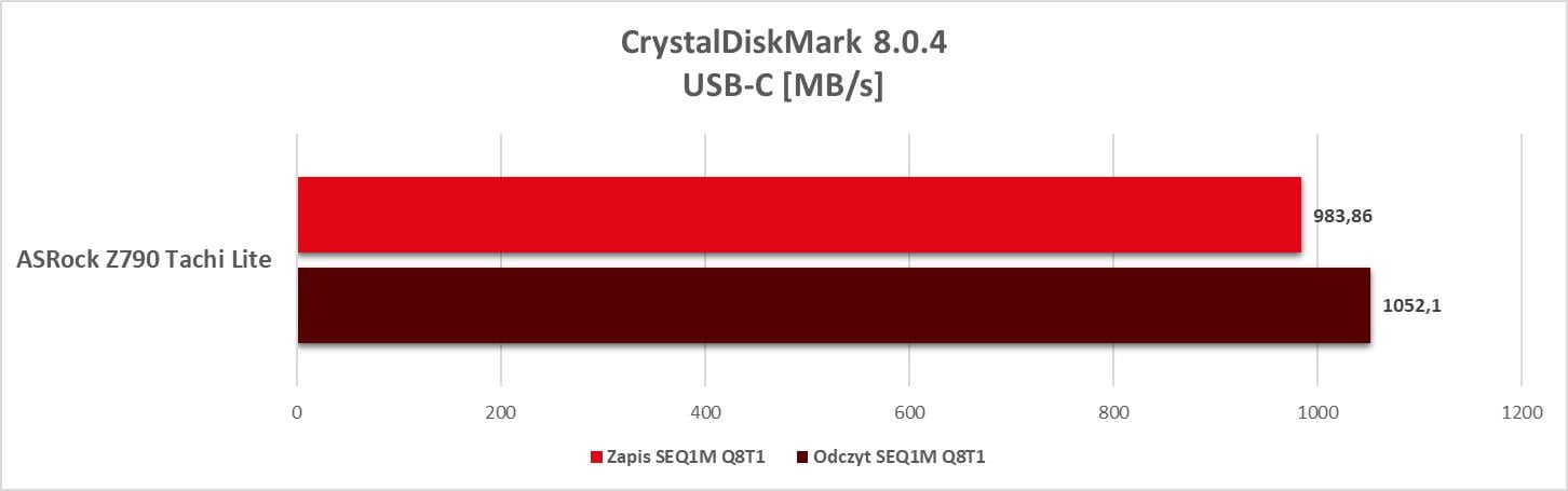 Testy wykonałem po włączeniu profilu XMP pamięci. Pozostałe opcje pozostawiłem domyślne – limity mocy były zdjęte. Porty USB testowałem na dysku Adata SE800 1 TB, SATA na Adata SU650 120 GB, a M.2 na Samsung 990 Pro 2TB.