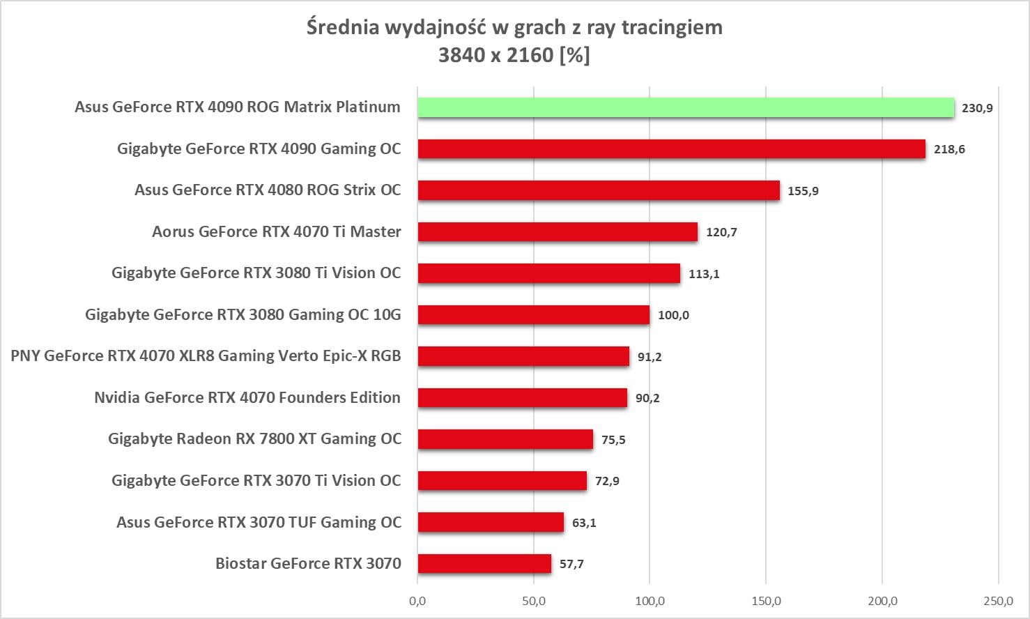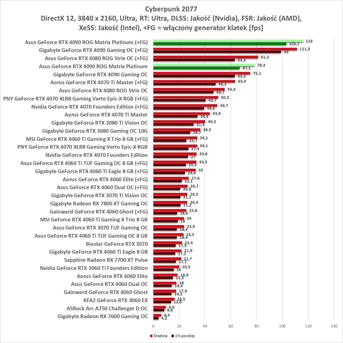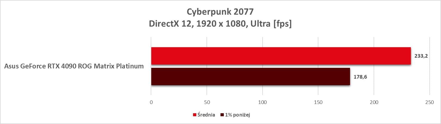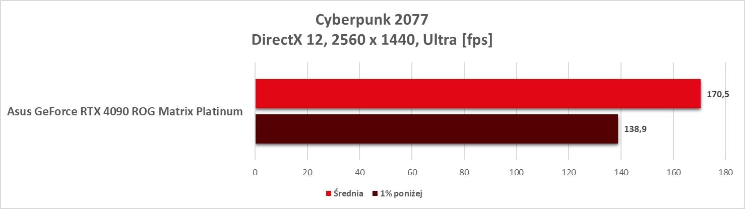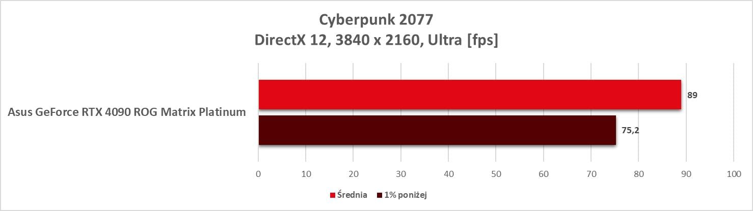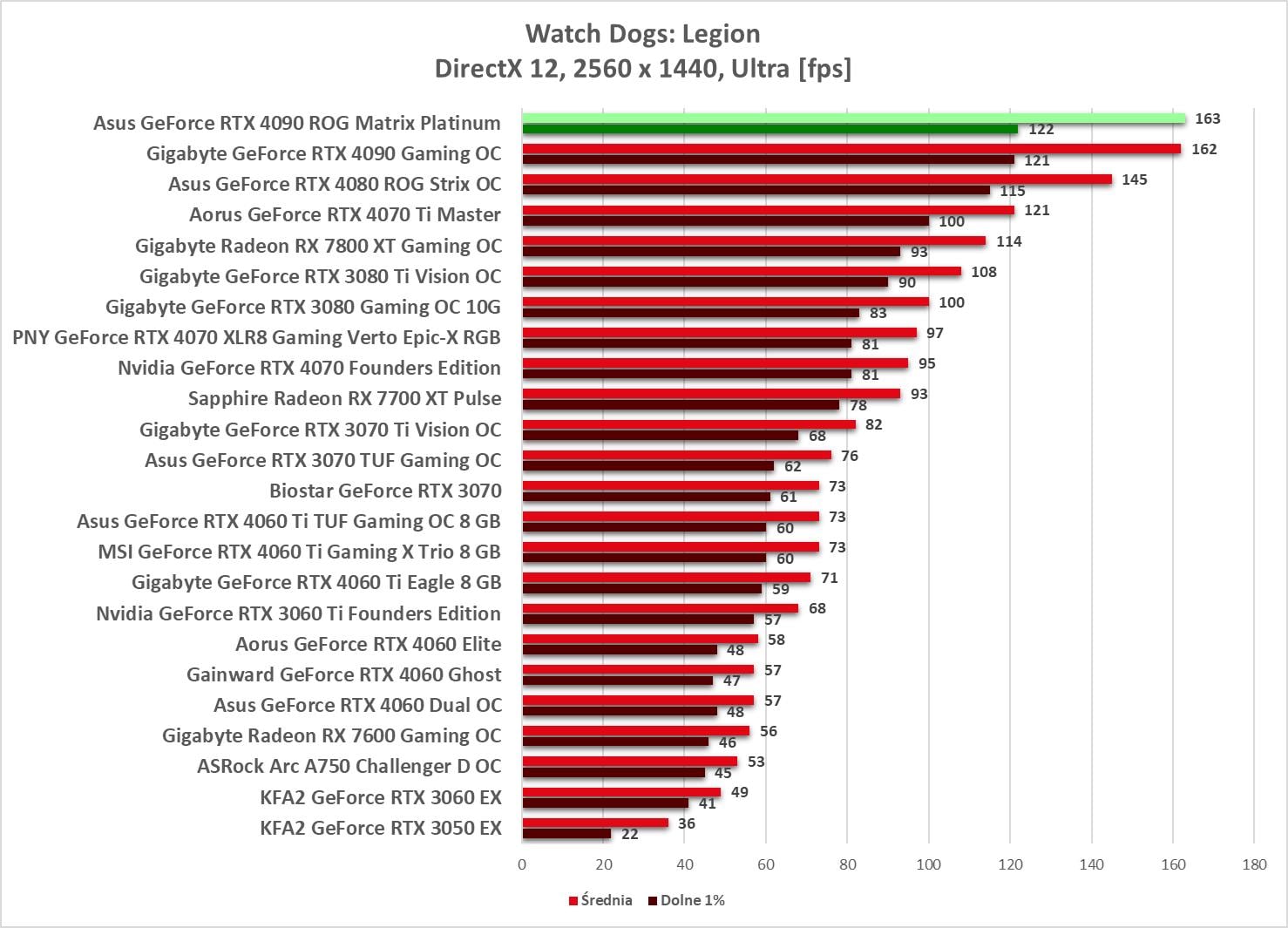 Asus GeForce RTX 4090 ROG Matrix Platinum to bez wątpienia najwydajniejszy model, jaki mieliśmy w rękach. Wyniki są świetne, a karta bez problemów wygrywa z innym modelem RTX 4090. Bez ray tracingu możecie też spokojnie włączać wszystkie gry na maksymalnych detalach notując powyżej 60 fps nawet w 3840 x 2160.