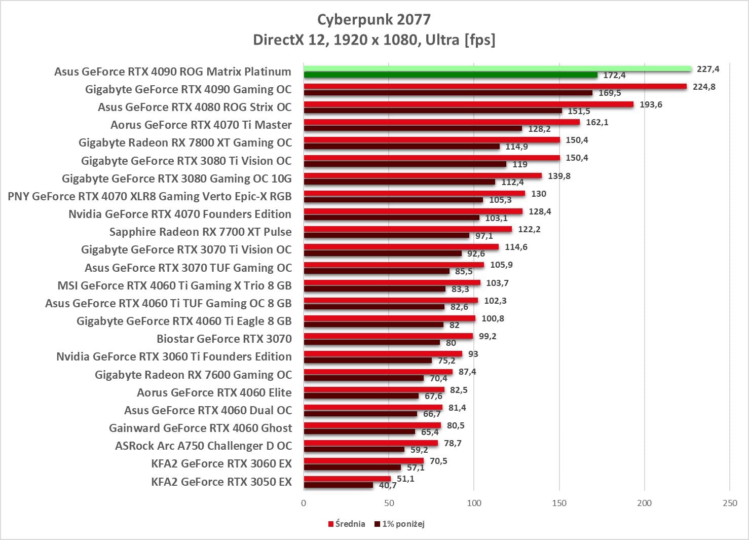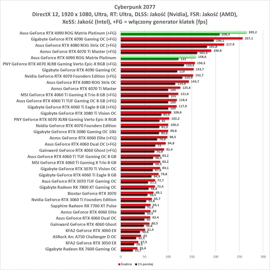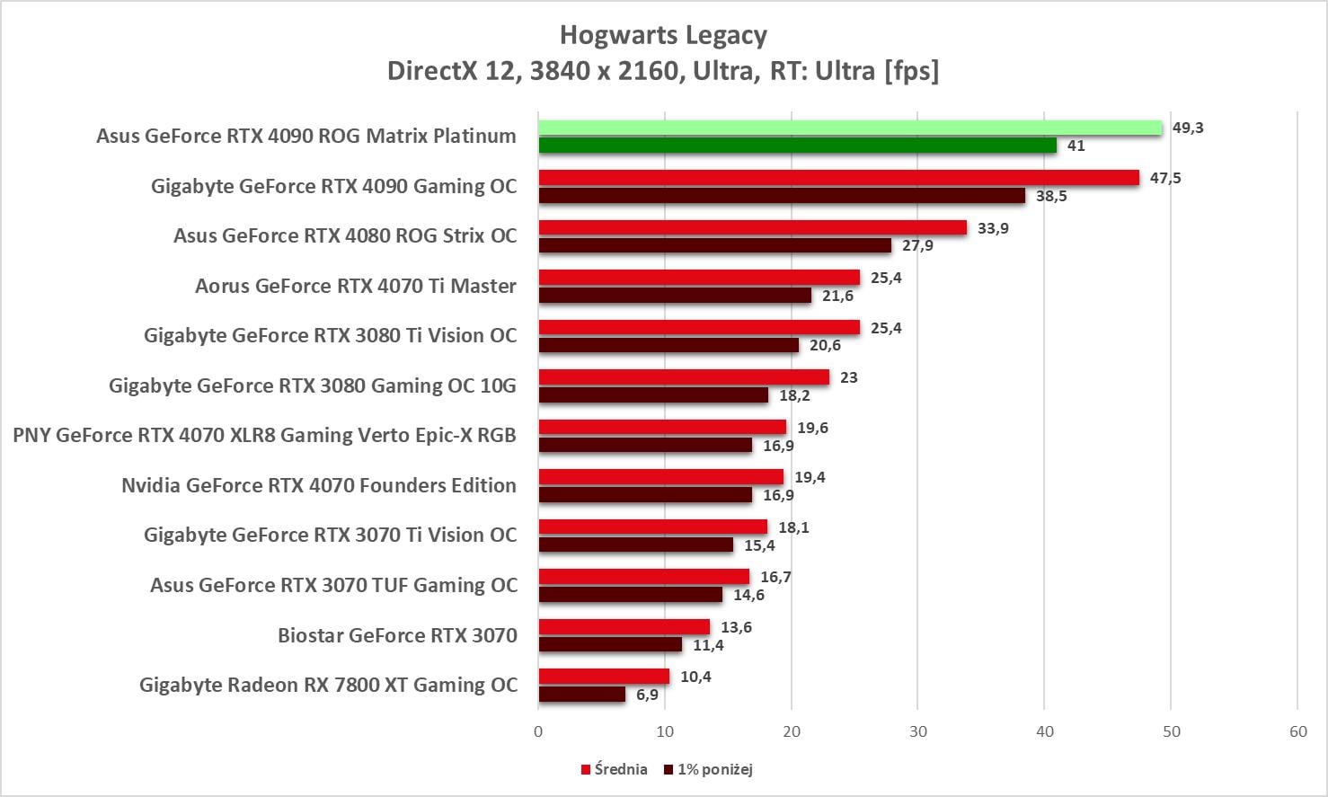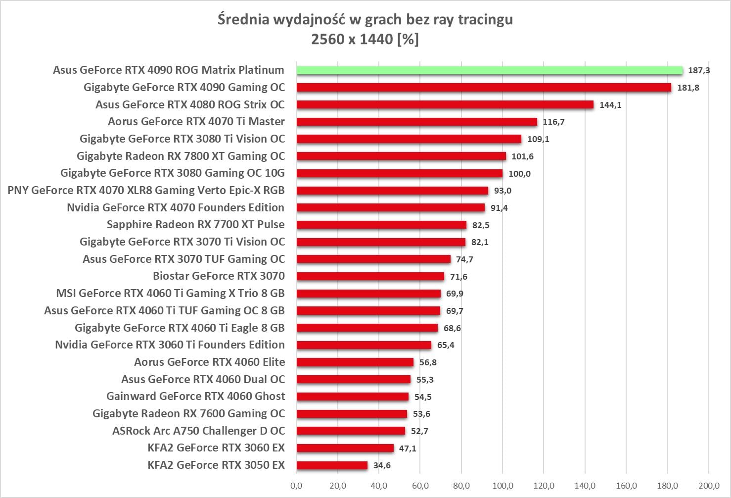Asus GeForce RTX 4090 ROG Matrix Platinum to bez wątpienia najwydajniejszy model, jaki mieliśmy w rękach. Wyniki są świetne, a karta bez problemów wygrywa z innym modelem RTX 4090. Bez ray tracingu możecie też spokojnie włączać wszystkie gry na maksymalnych detalach notując powyżej 60 fps nawet w 3840 x 2160.