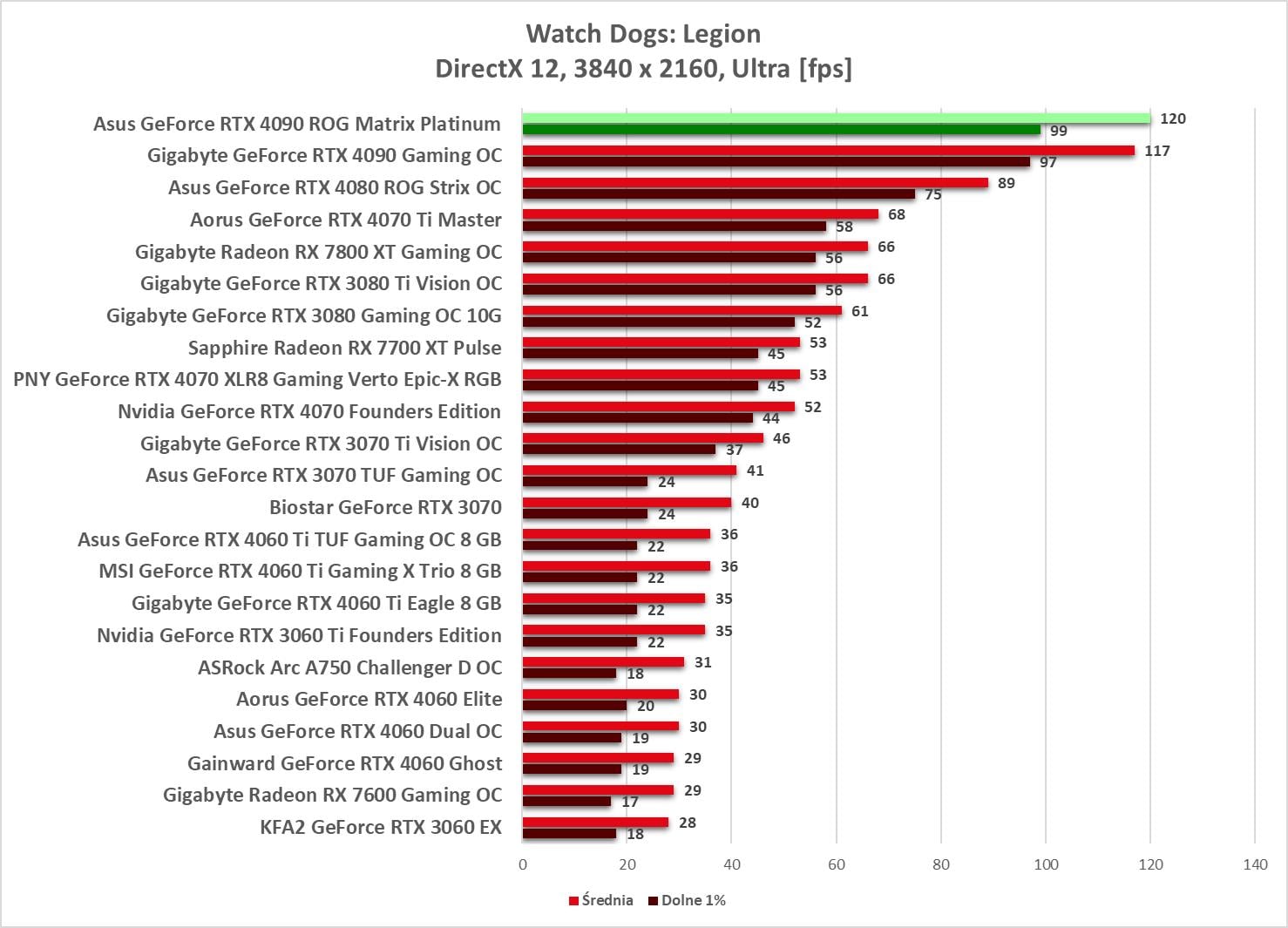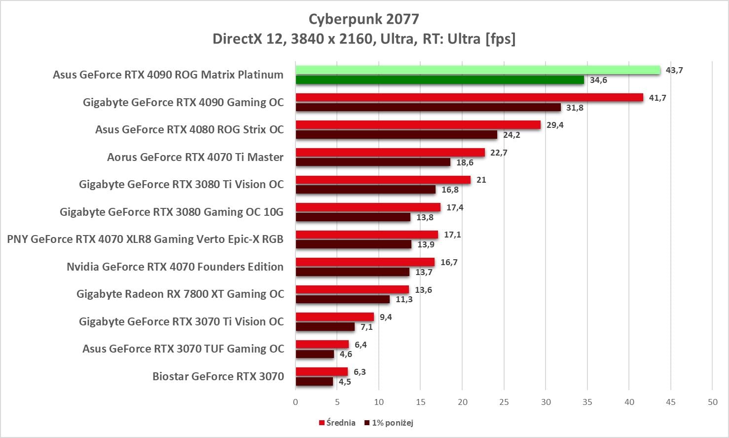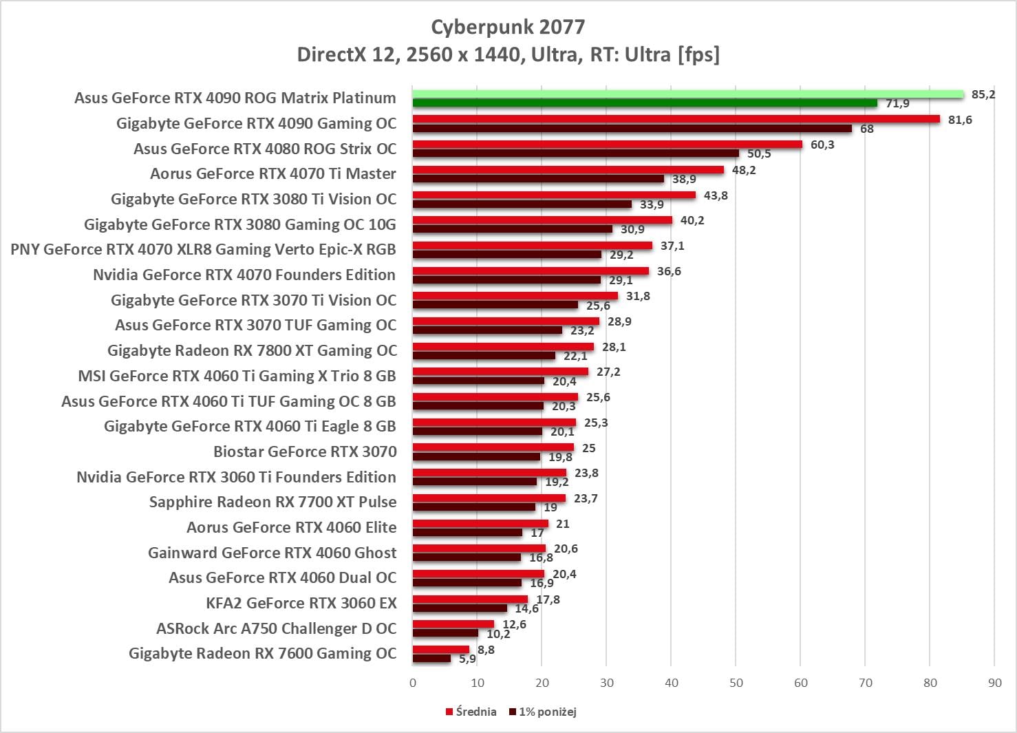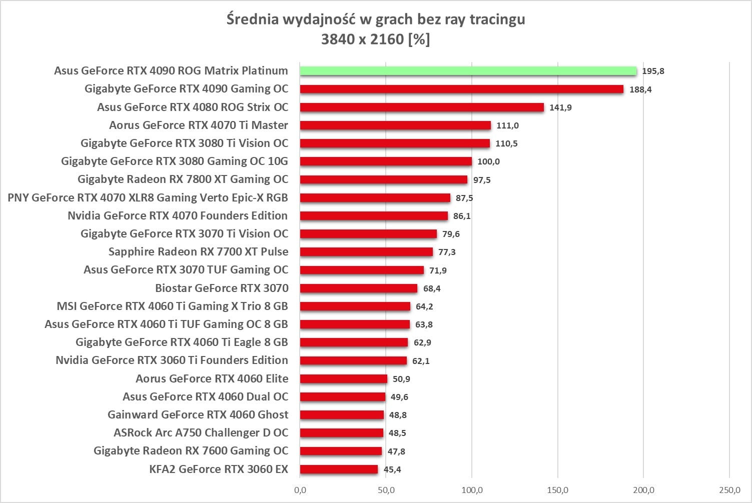 Asus GeForce RTX 4090 ROG Matrix Platinum to bez wątpienia najwydajniejszy model, jaki mieliśmy w rękach. Wyniki są świetne, a karta bez problemów wygrywa z innym modelem RTX 4090. Bez ray tracingu możecie też spokojnie włączać wszystkie gry na maksymalnych detalach notując powyżej 60 fps nawet w 3840 x 2160.