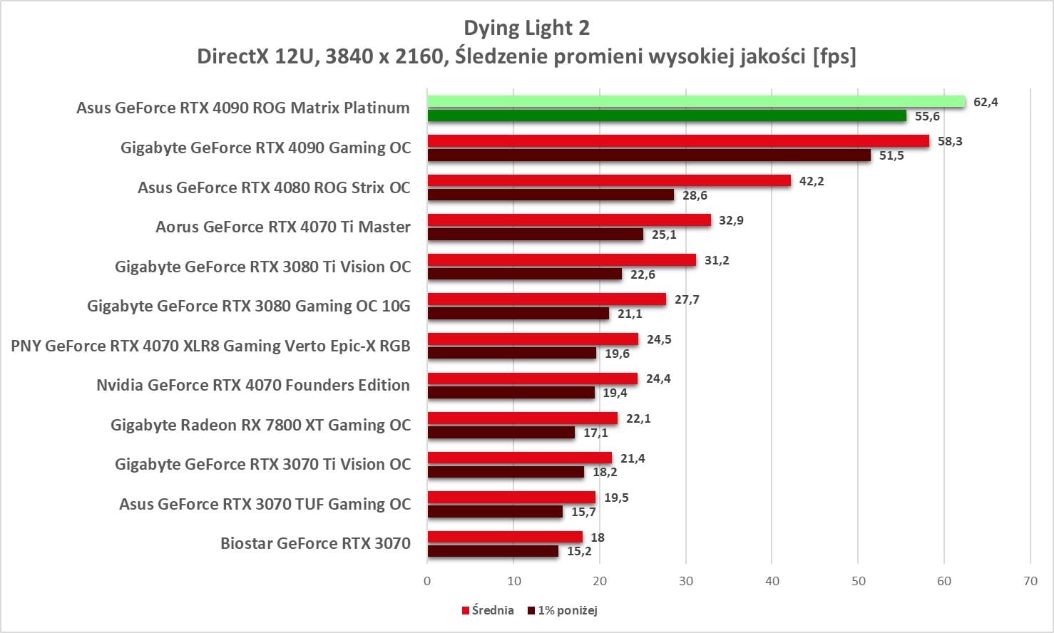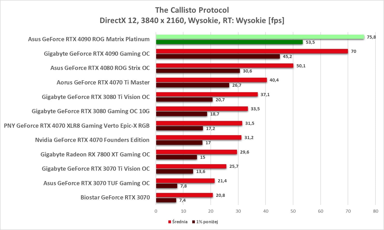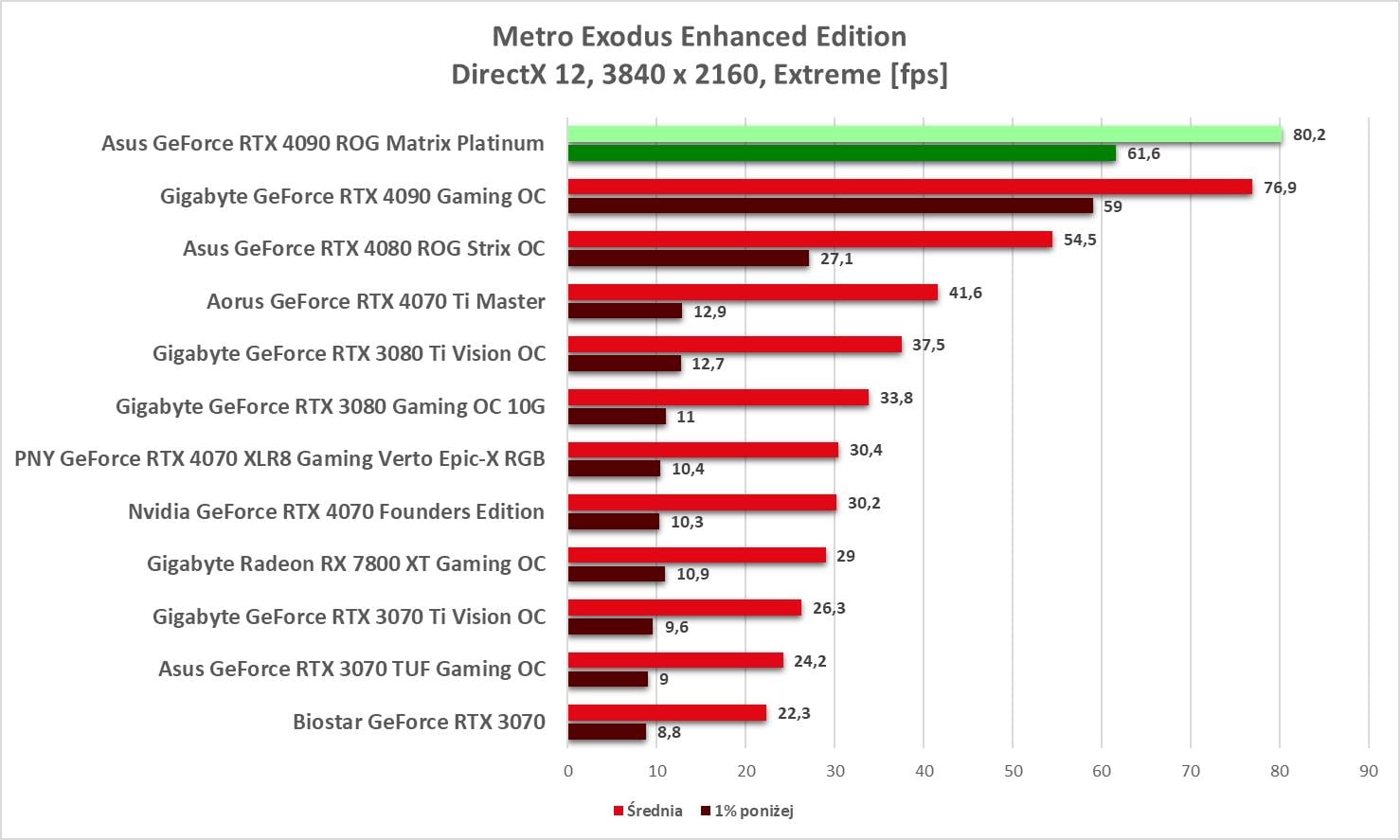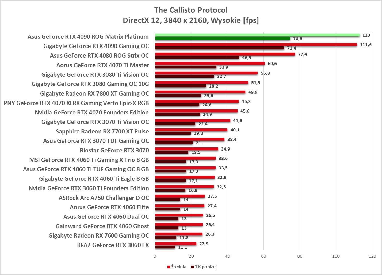 Asus GeForce RTX 4090 ROG Matrix Platinum to bez wątpienia najwydajniejszy model, jaki mieliśmy w rękach. Wyniki są świetne, a karta bez problemów wygrywa z innym modelem RTX 4090. Bez ray tracingu możecie też spokojnie włączać wszystkie gry na maksymalnych detalach notując powyżej 60 fps nawet w 3840 x 2160.