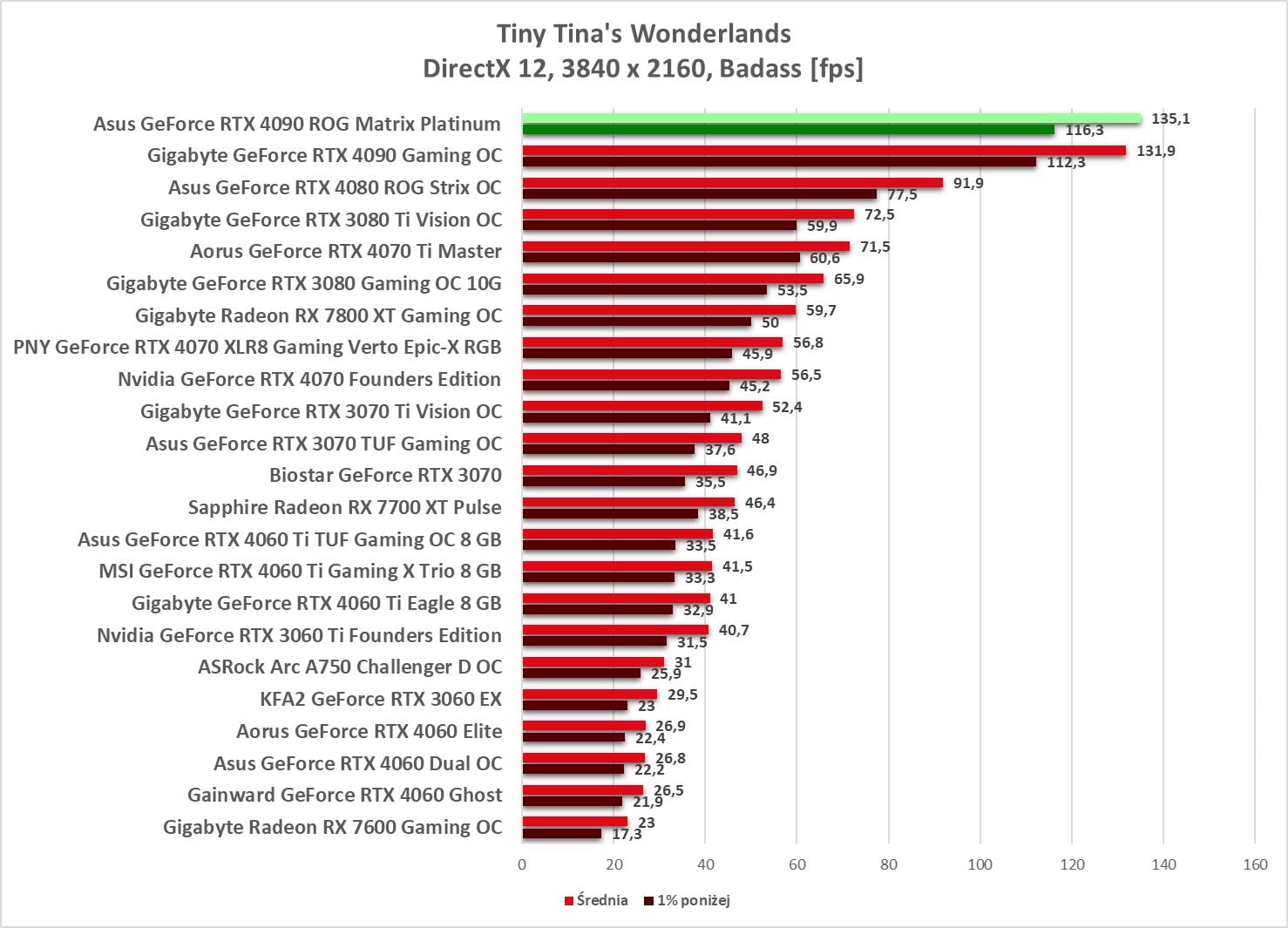W ostatniej rozdzielczości we wszystkich grach mamy powyżej 60 fps. Dotyczy to również 1% poniżej, który również notuje wyższe wyniki.