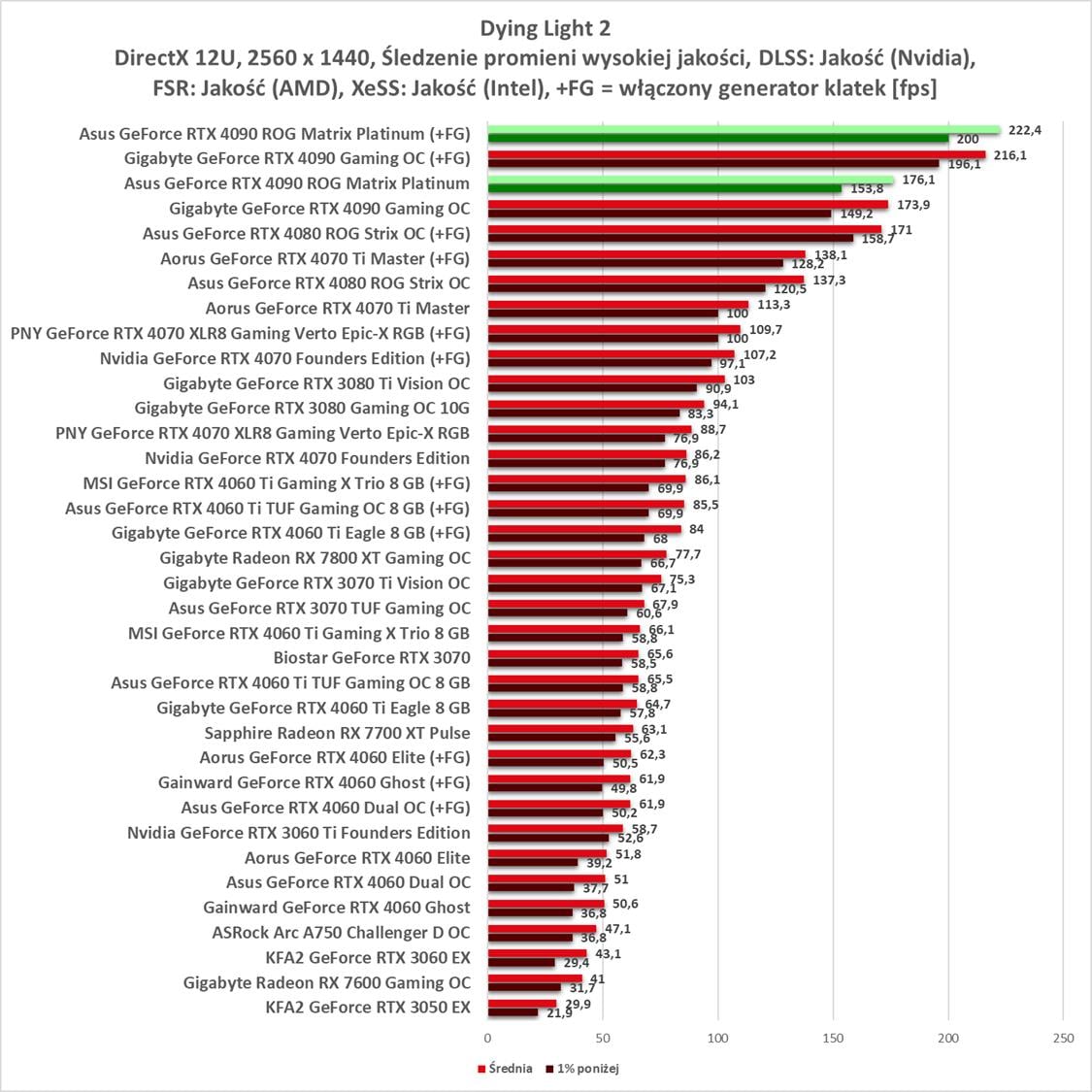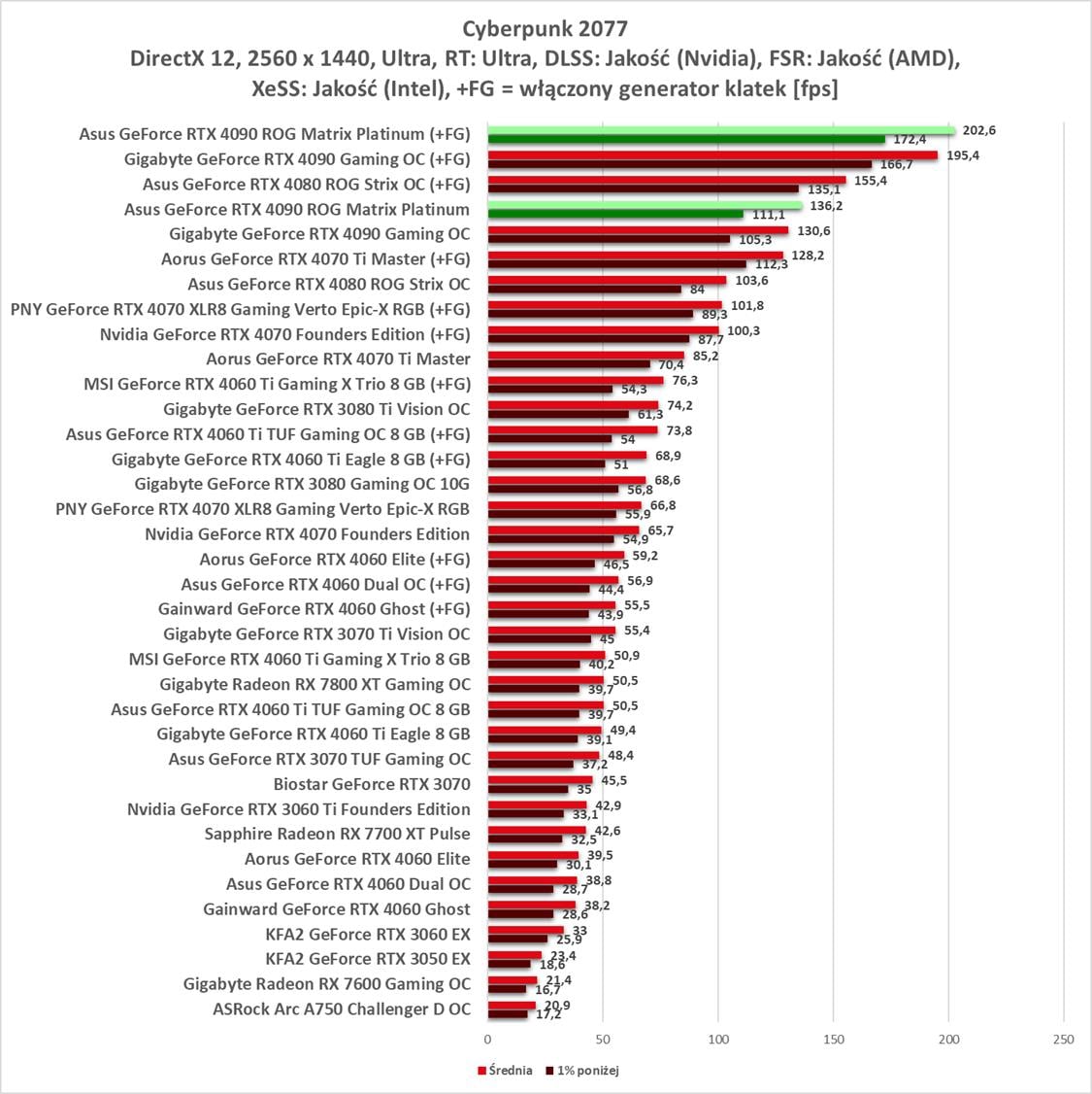W kolejnej rozdzielczości ponownie są świetnie wyniki. Z generatorem klatek mamy nawet powyżej 200 fps w obu tytułach.