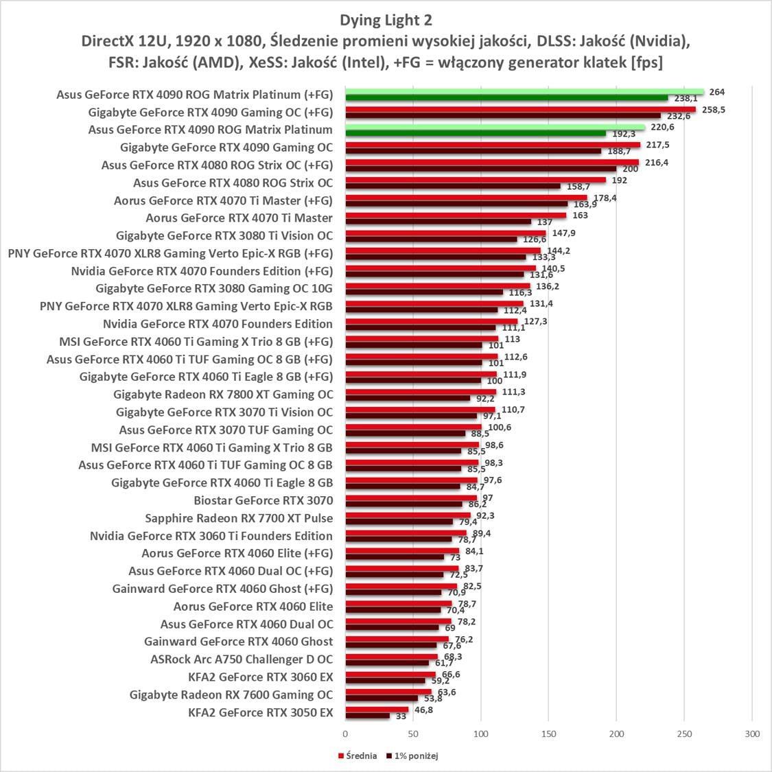 Dopiero w ostatniej rozdzielczości są dwie gry ze średnio poniżej 60 fps. Tutaj przyda się DLSS: Jakość, aby zwiększyć te wyniki.