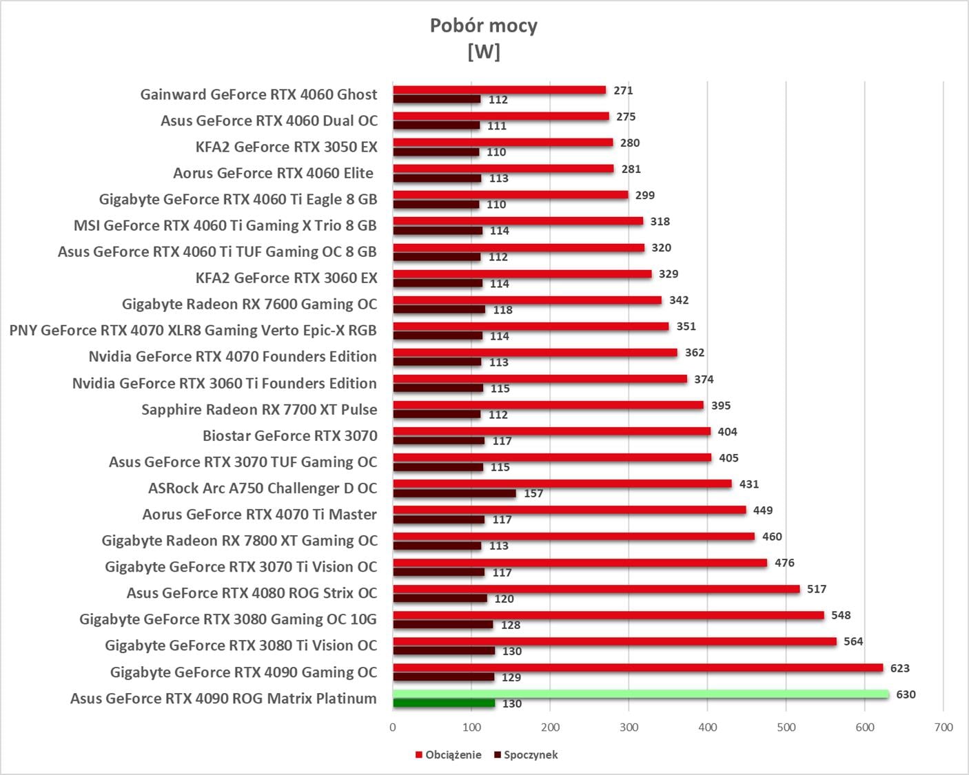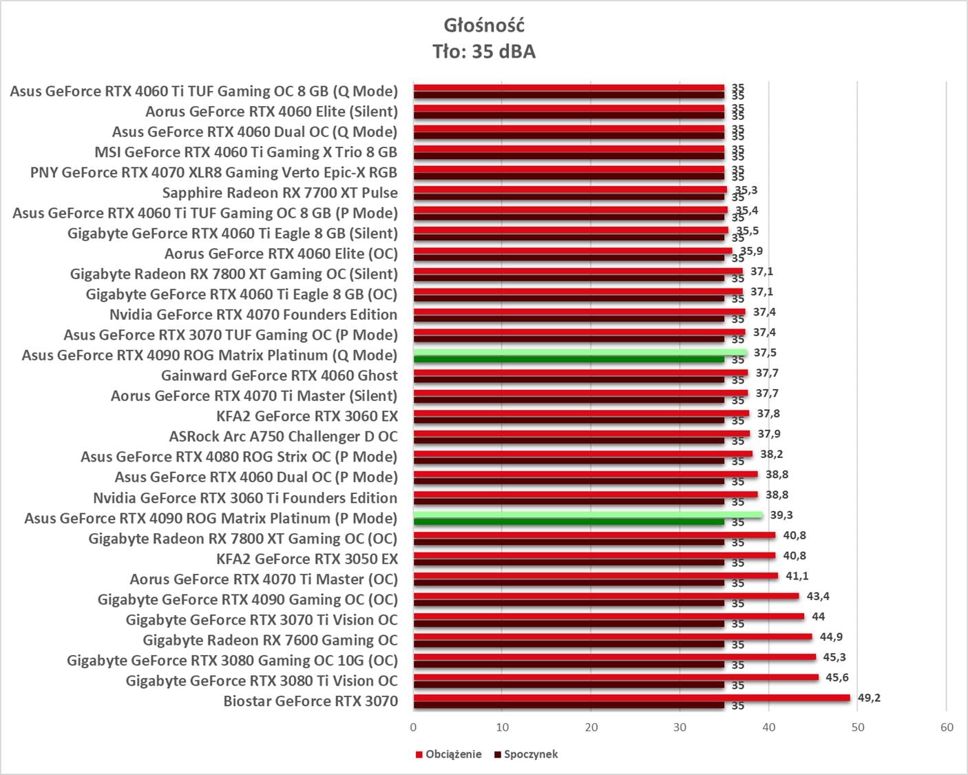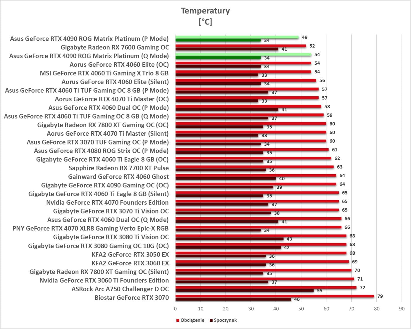W spoczynku wentylatory nie działają, więc mamy idealną ciszę przy zachowaniu niskich temperatur. Pod obciążeniem w trybie P mamy poniżej 39,3 dBA, co nie jest może niskim wynikiem, ale też nie powinno to przeszkadzać. W trybie Q jest już naprawdę cicho. Temperatury przy obu są bardzo niskie, więc polecam od razu włączenie trybu Q. Pobór mocy jest najwyższy spośród kart, choć jest tylko niewiele wyższy niż w przypadku podkręconego RTX 4090 od Gigabyte.