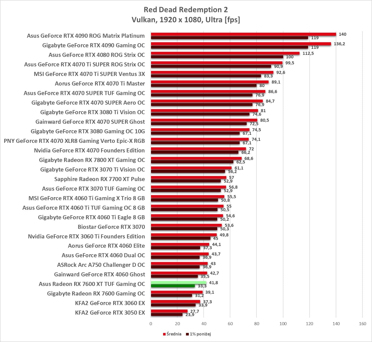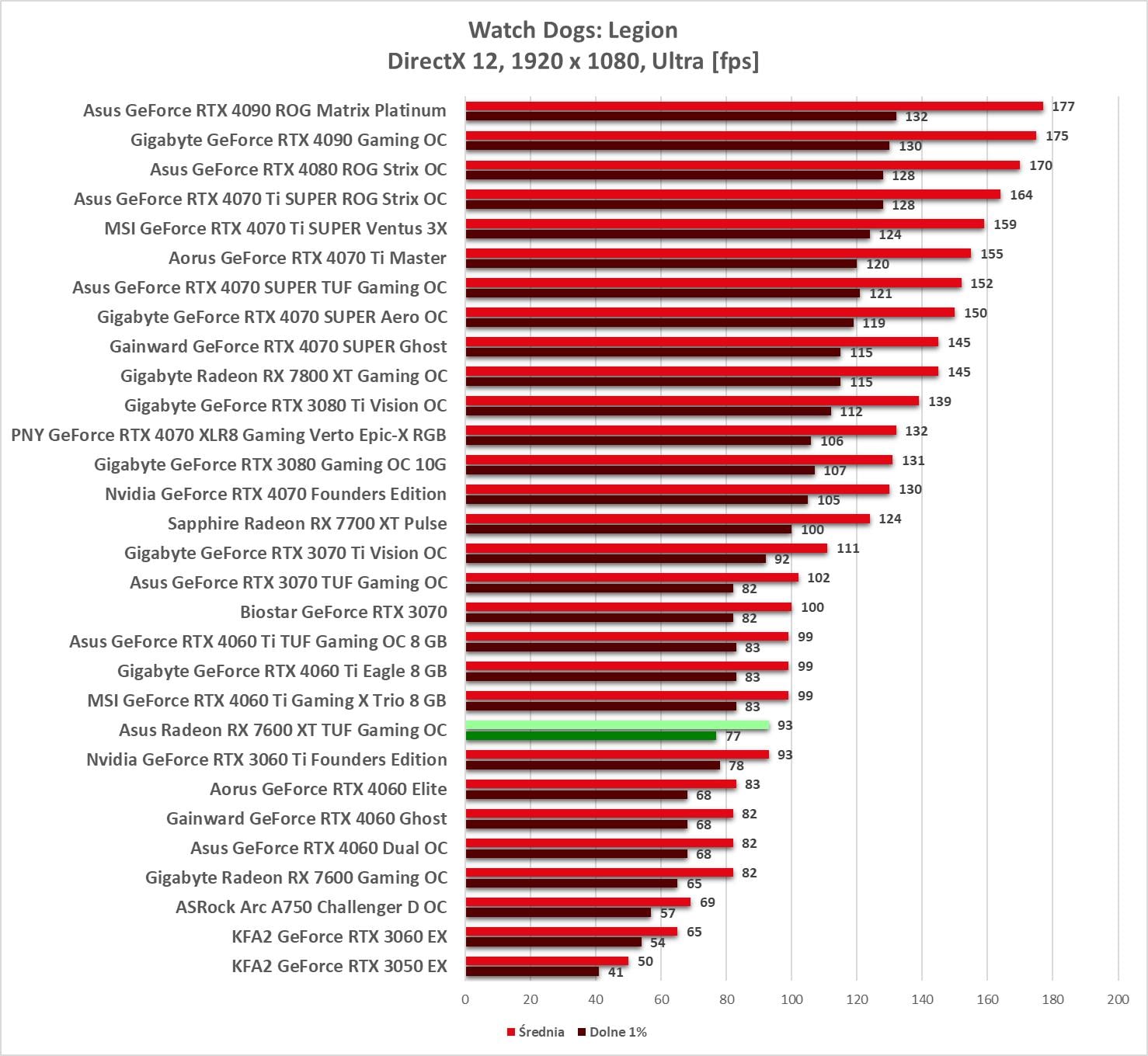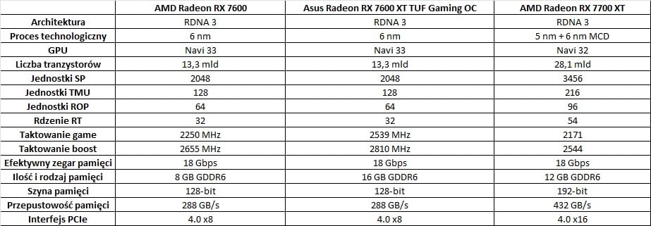 RX 7600 XT ma sugerowaną cenę 329 dolarów, co po przeliczeniu i dodaniu 23% VAT wychodzi ok. 1620 zł. Testowany model ma fabryczne OC, jest z serii TUF więc z pewnością będzie droższy. Sprawia to, że karta jest bezpośrednią konkurencją dla RTX 4060, z którym to należy ją porównywać.