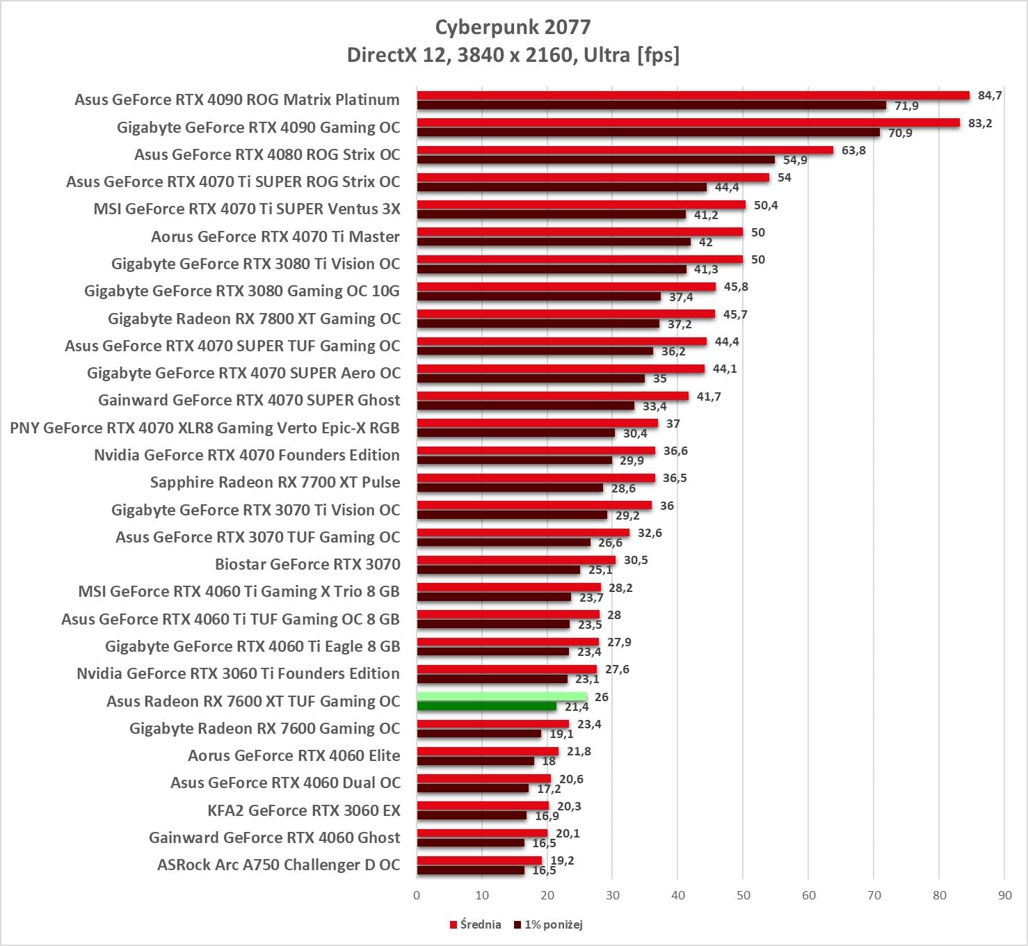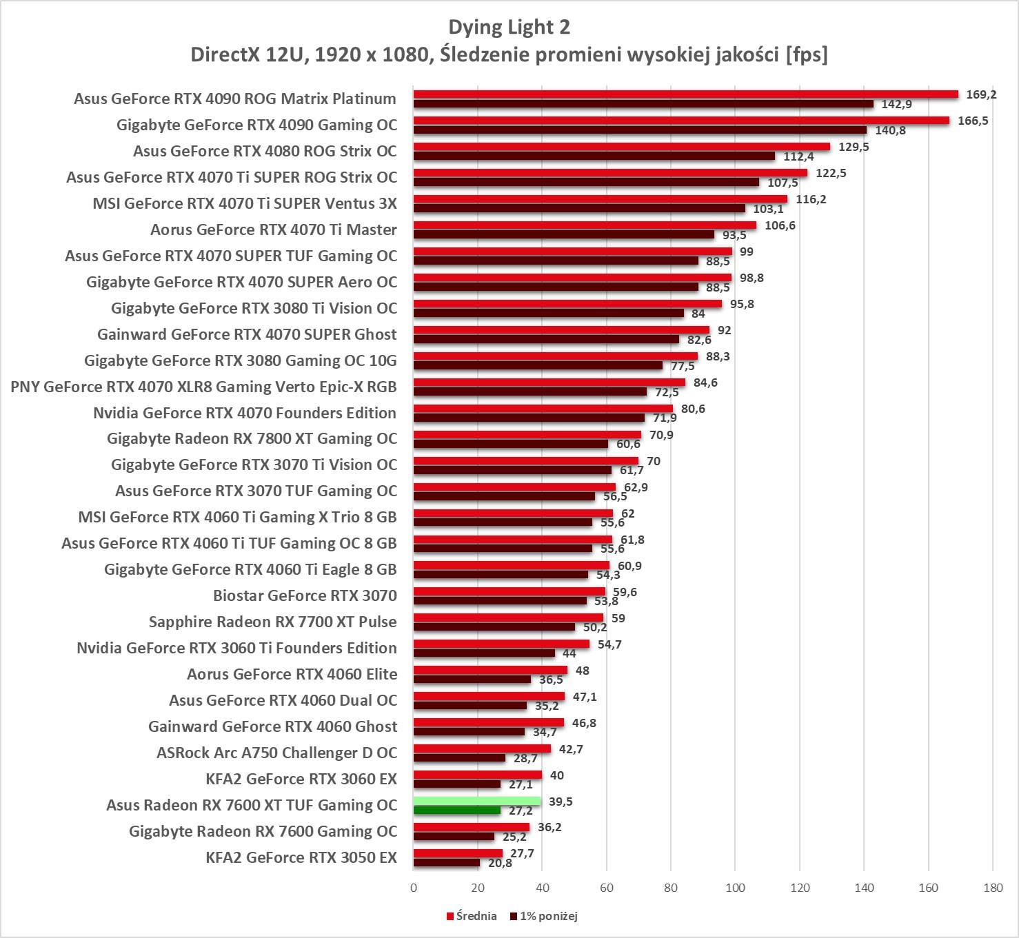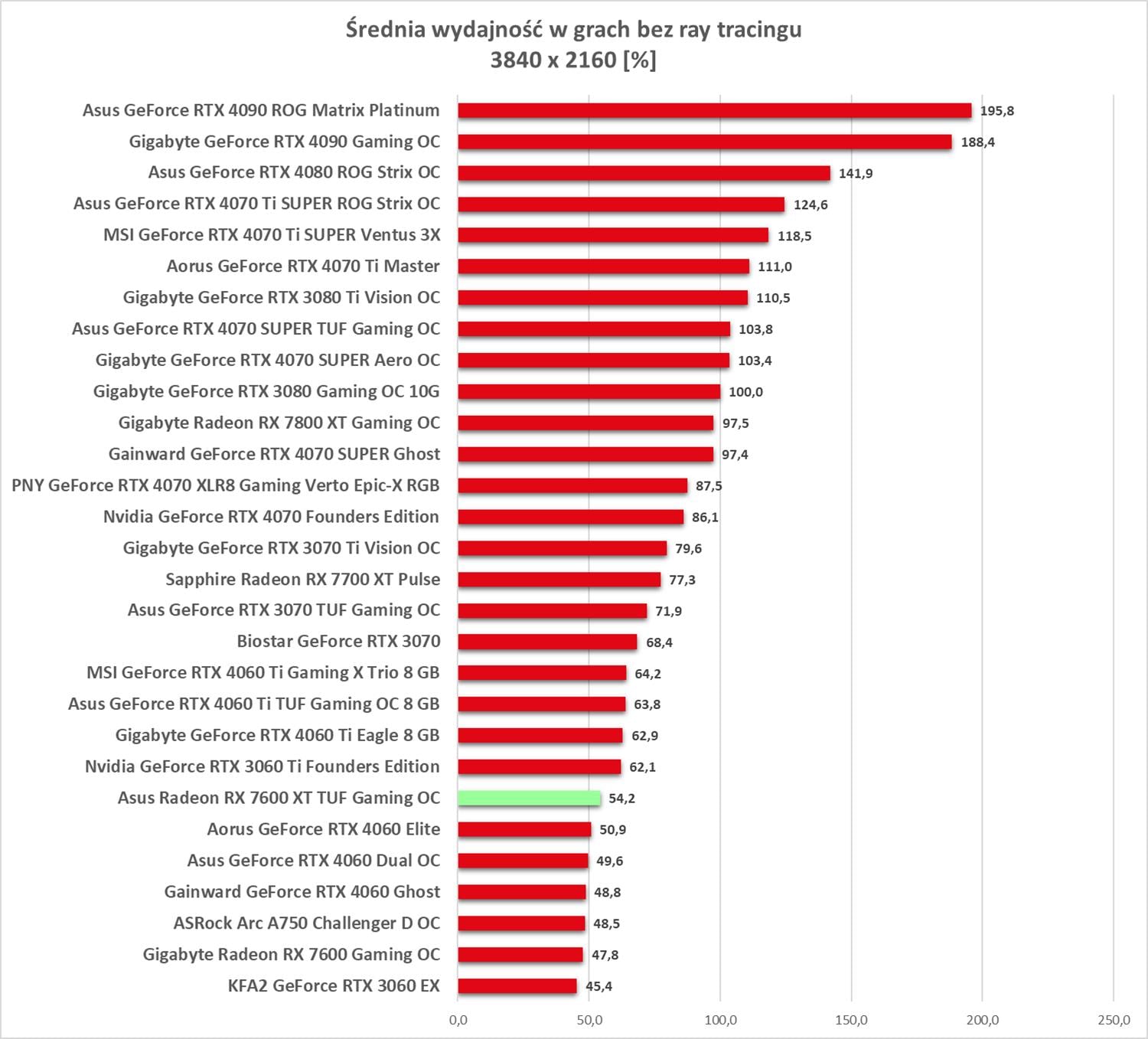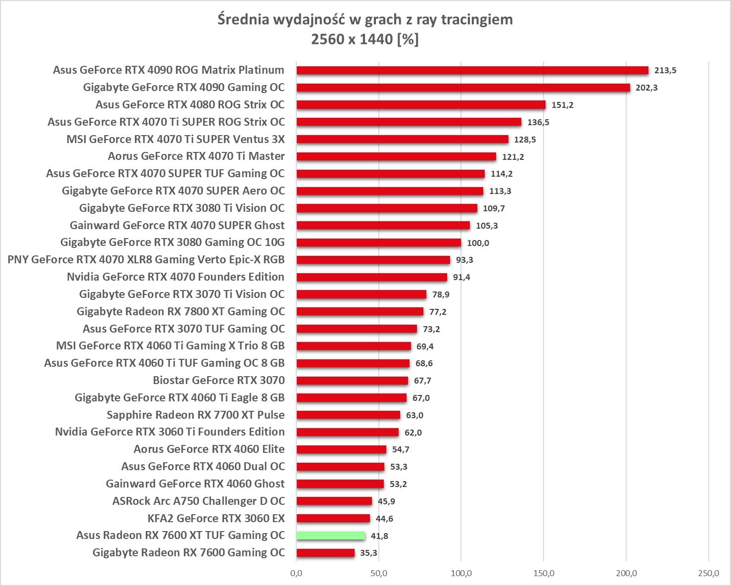 Asus Radeon RX 7600 XT TUF Gaming OC w rasteryzacji bez problemów wygrywa średnio z RTX 4060 w podkręconej wersji. Przewaga wynosi kolejno ok. 4,4%, 3,9% oraz 6,4%. Nie jest ona duża, ale z pewnością jest widoczna. Natomiast karta cały czas przegrywa z RTX 3060 Ti czy 4060 Ti.