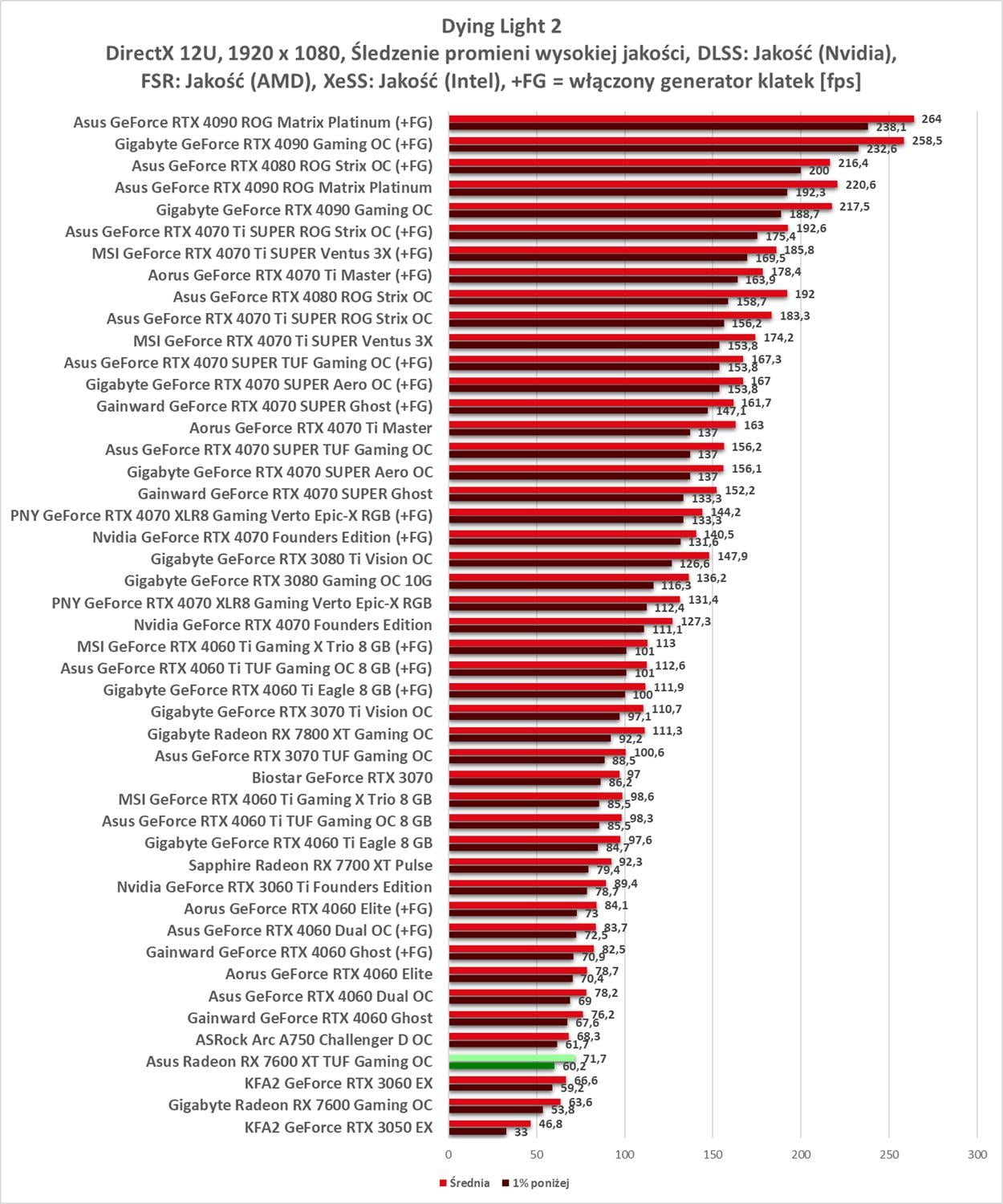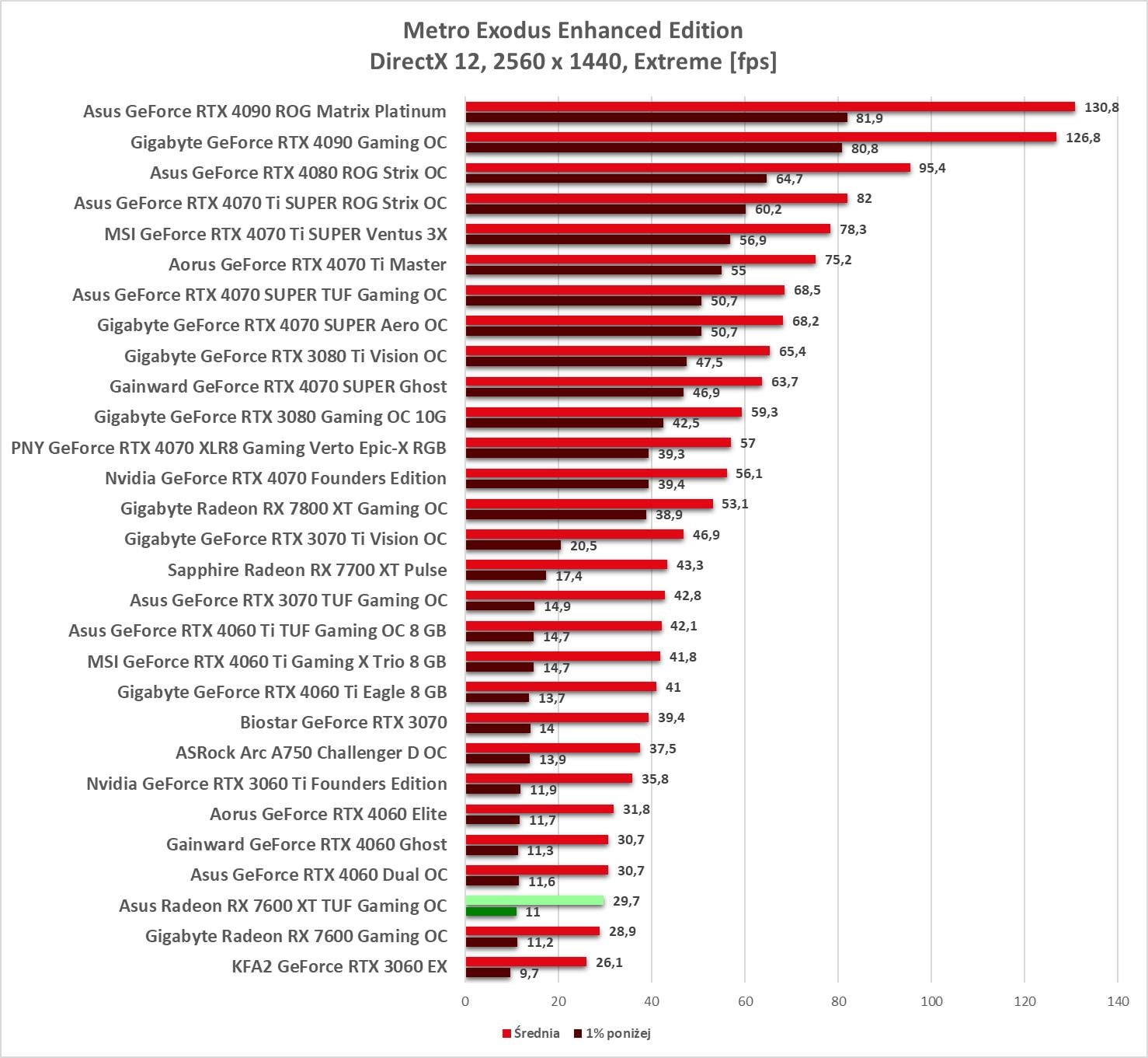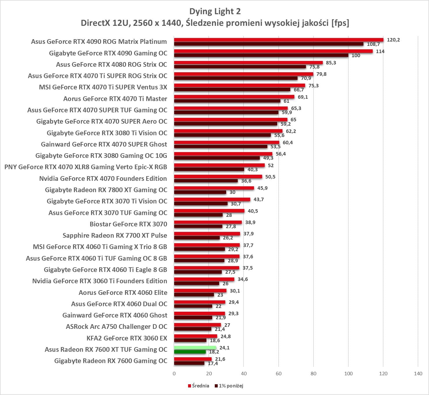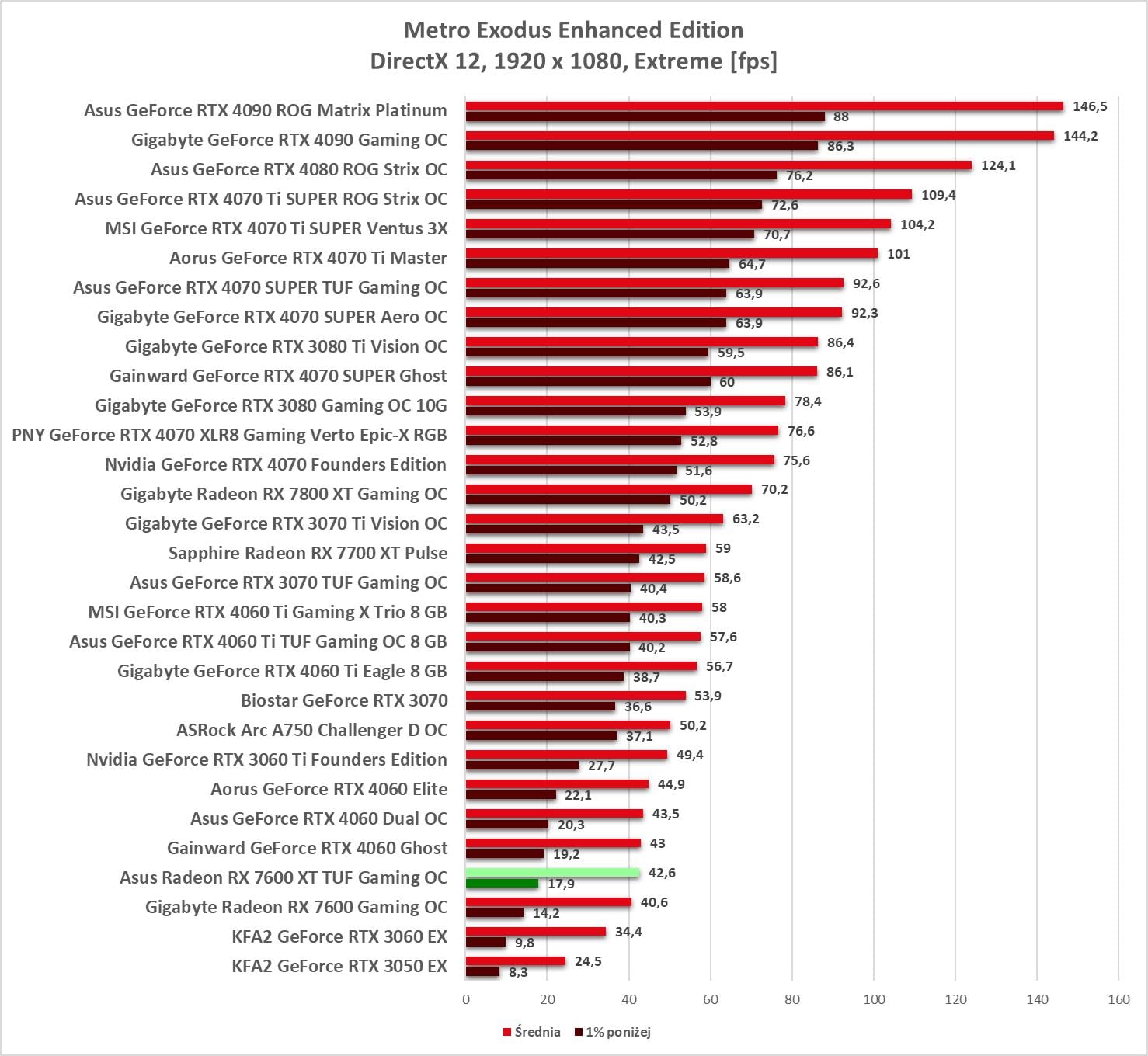 Asus Radeon RX 7600 XT TUF Gaming OC w rasteryzacji bez problemów wygrywa średnio z RTX 4060 w podkręconej wersji. Przewaga wynosi kolejno ok. 4,4%, 3,9% oraz 6,4%. Nie jest ona duża, ale z pewnością jest widoczna. Natomiast karta cały czas przegrywa z RTX 3060 Ti czy 4060 Ti.