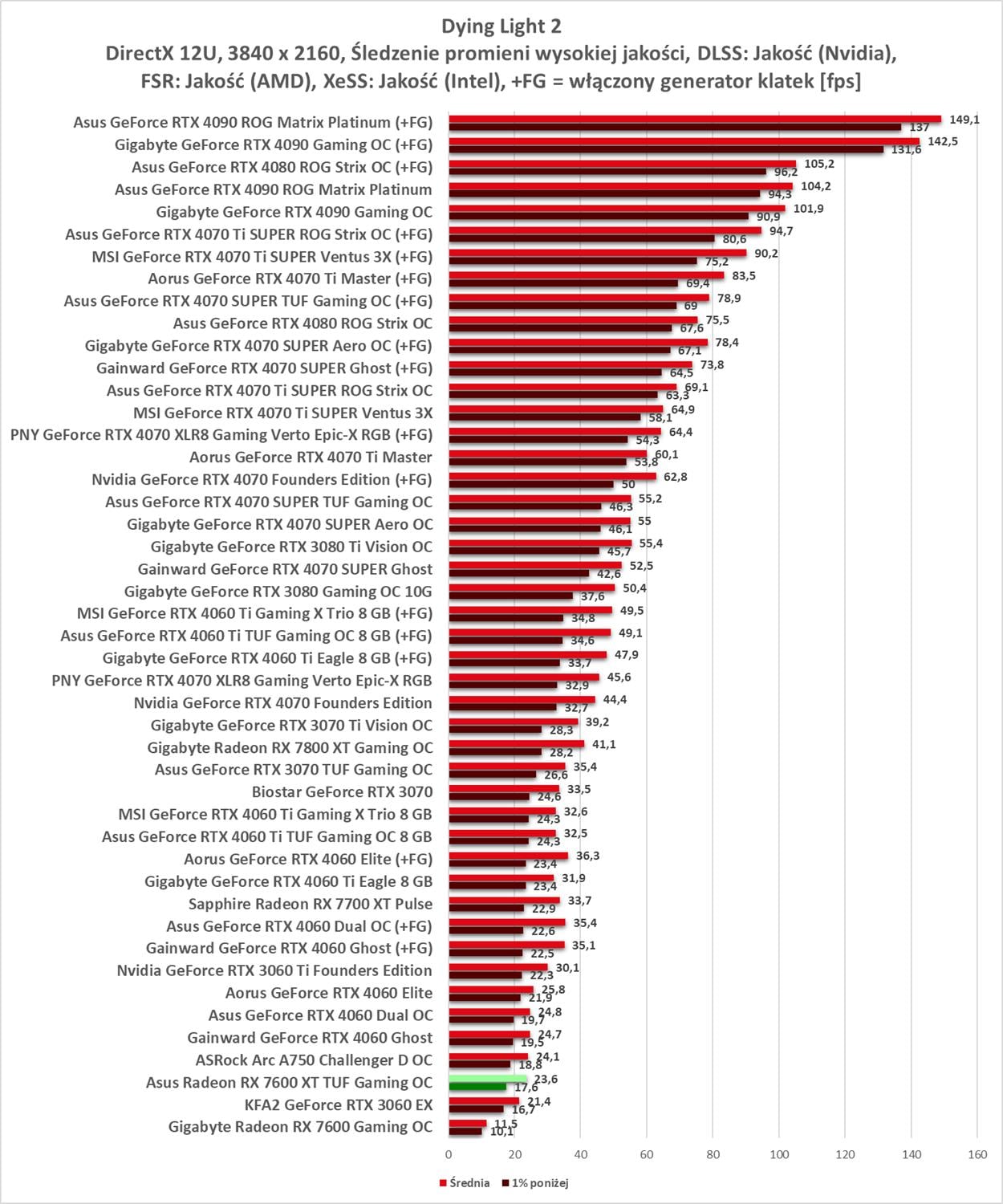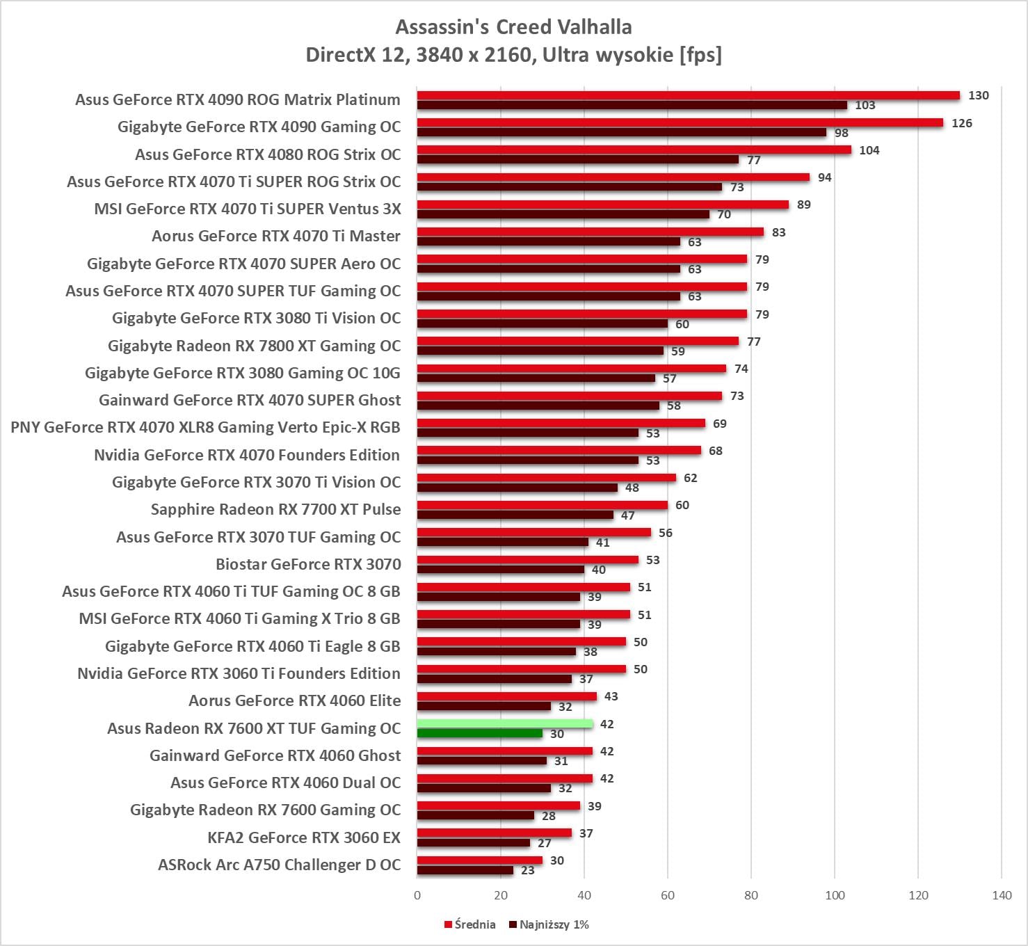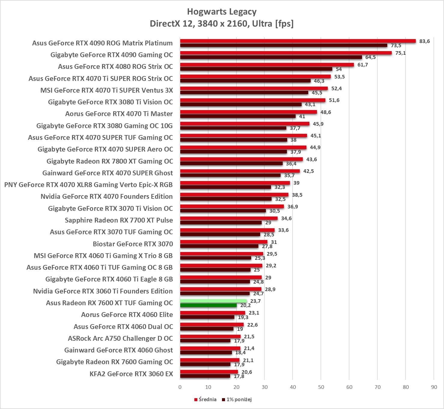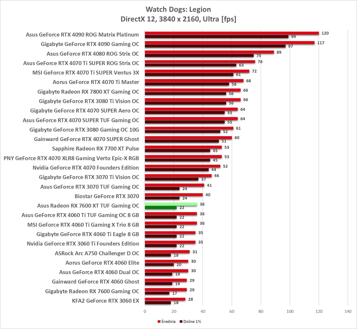 Asus Radeon RX 7600 XT TUF Gaming OC w rasteryzacji bez problemów wygrywa średnio z RTX 4060 w podkręconej wersji. Przewaga wynosi kolejno ok. 4,4%, 3,9% oraz 6,4%. Nie jest ona duża, ale z pewnością jest widoczna. Natomiast karta cały czas przegrywa z RTX 3060 Ti czy 4060 Ti.