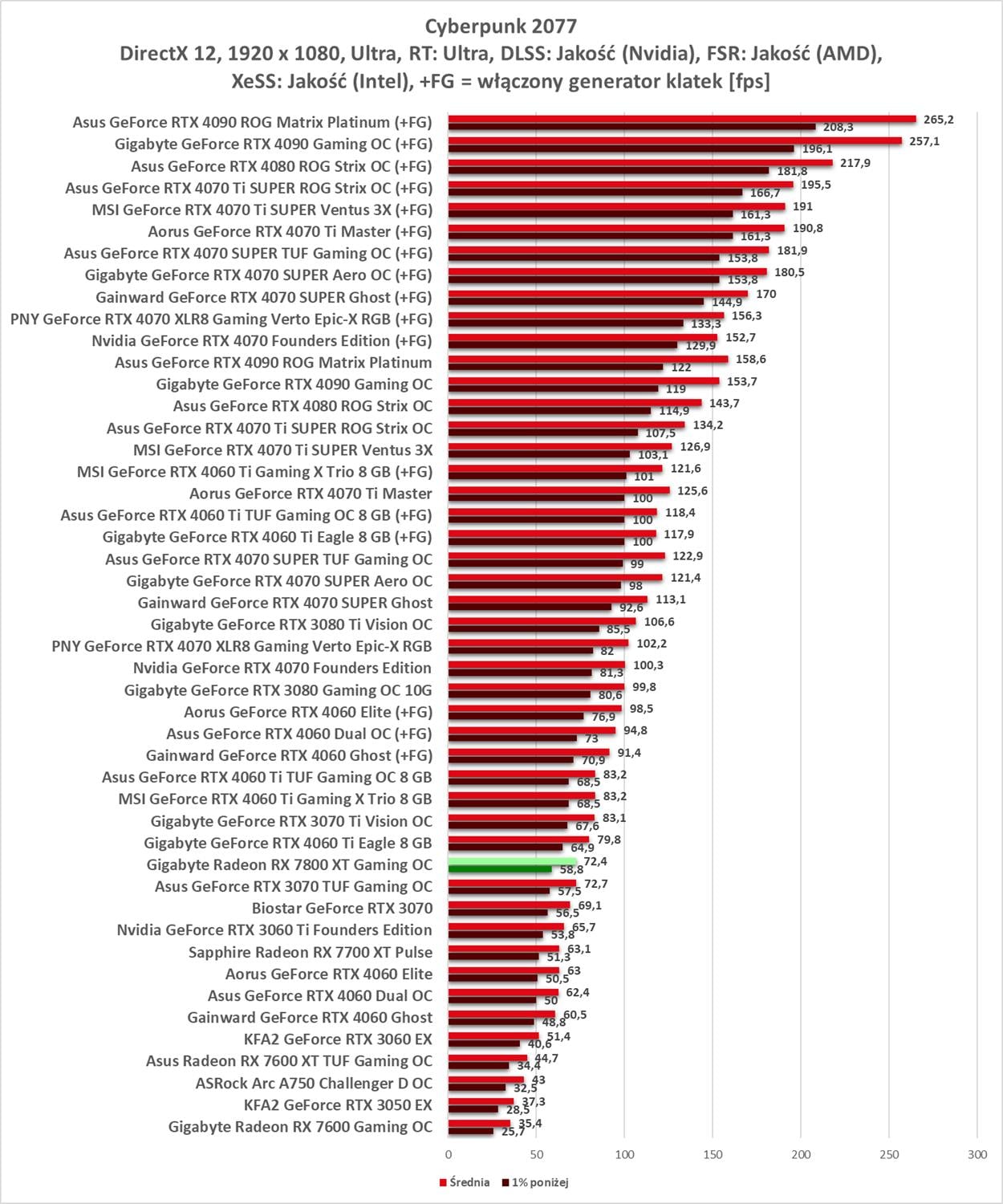 Karty AMD zazwyczaj słabiej wypadają w ray tracingu i nie ma tutaj zaskoczenia. RTX 4060 Aorus Elite ma przewagę kolejno ok. 23,2% oraz 30,8%. Jest więc ona naprawdę spora i widać, że pod tym względem AMD ma jeszcze sporo do nadgonienia. Z drugiej strony model XT wygrywa z wersją bez tego dopisku o kolejno ok. 15,5% oraz 18,4%.