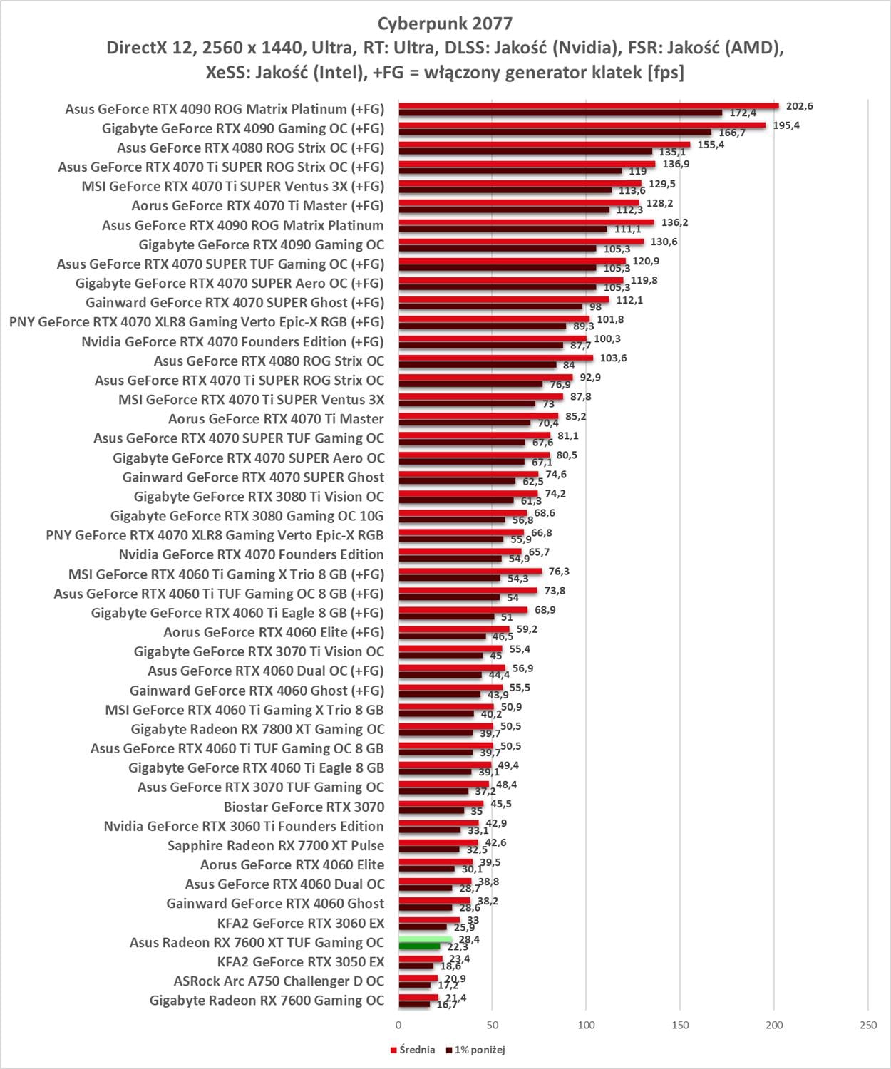 W 2560 x 1400 z RT każdy z tytułów notuje bardzo niskie wyniki i tak naprawdę nie da się tutaj grać. FSR 3 musi więc trafić do jak największej ilości gier, aby zmienić tę sytuację.