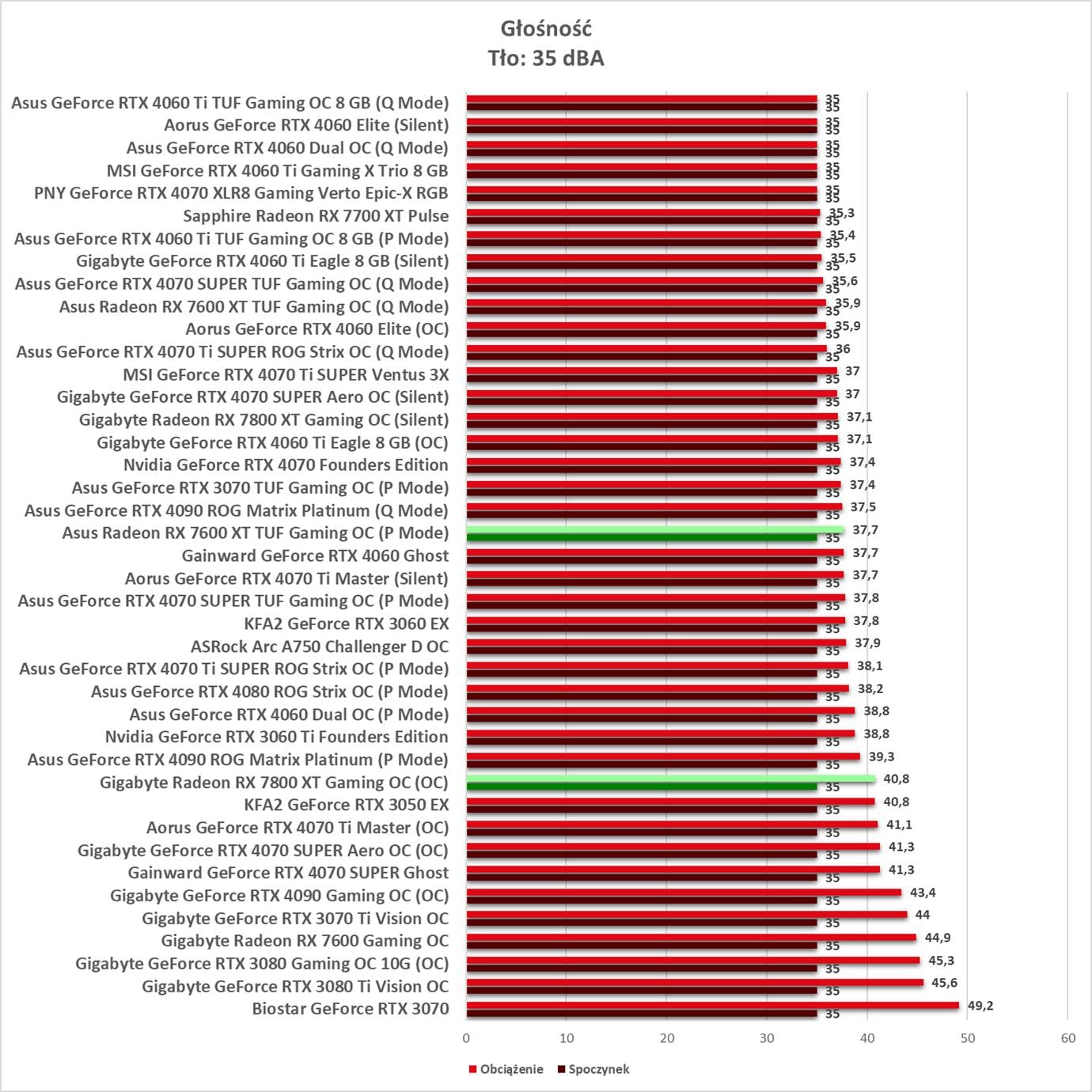 W spoczynku na obu BIOSach wentylatory nie pracują, więc mamy idealną ciszę. Pod obciążeniem w trybie P jest naprawdę chłodno, a karta pracuje cicho. W trybie Q jest nadal chłodno, choć widać różnicę w temperaturach, ale karta jest praktycznie bezgłośna. Pobór mocy jest za to trochę powyżej RTX 4070 Founders Edition. Pod tym względem jest słabo w szczególności, że jest spora różnica w wydajności. Widać też, że RTX 4060 w wersji Aorus Elite ma niższy pobór mocy o 94 W pod obciążenie.