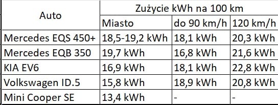 Chyba nie będziemy oryginalni jeśli powiemy – to zależy. Choć tutaj w pełni zgadzamy się ze zdaniem, jakie usłyszeliśmy od jednego z trenerów bezpiecznej jazdy Mercedesa, że zużycie wyższe niż 23 kWh na 100 km sugeruje, że coś jest nie tak z samochodem lub kierowcą. Albo zwyczajnie jedziecie powyżej 140 km/h. Jeśli chodzi o testowane auta, to zużycie wyglądało w nich następująco.