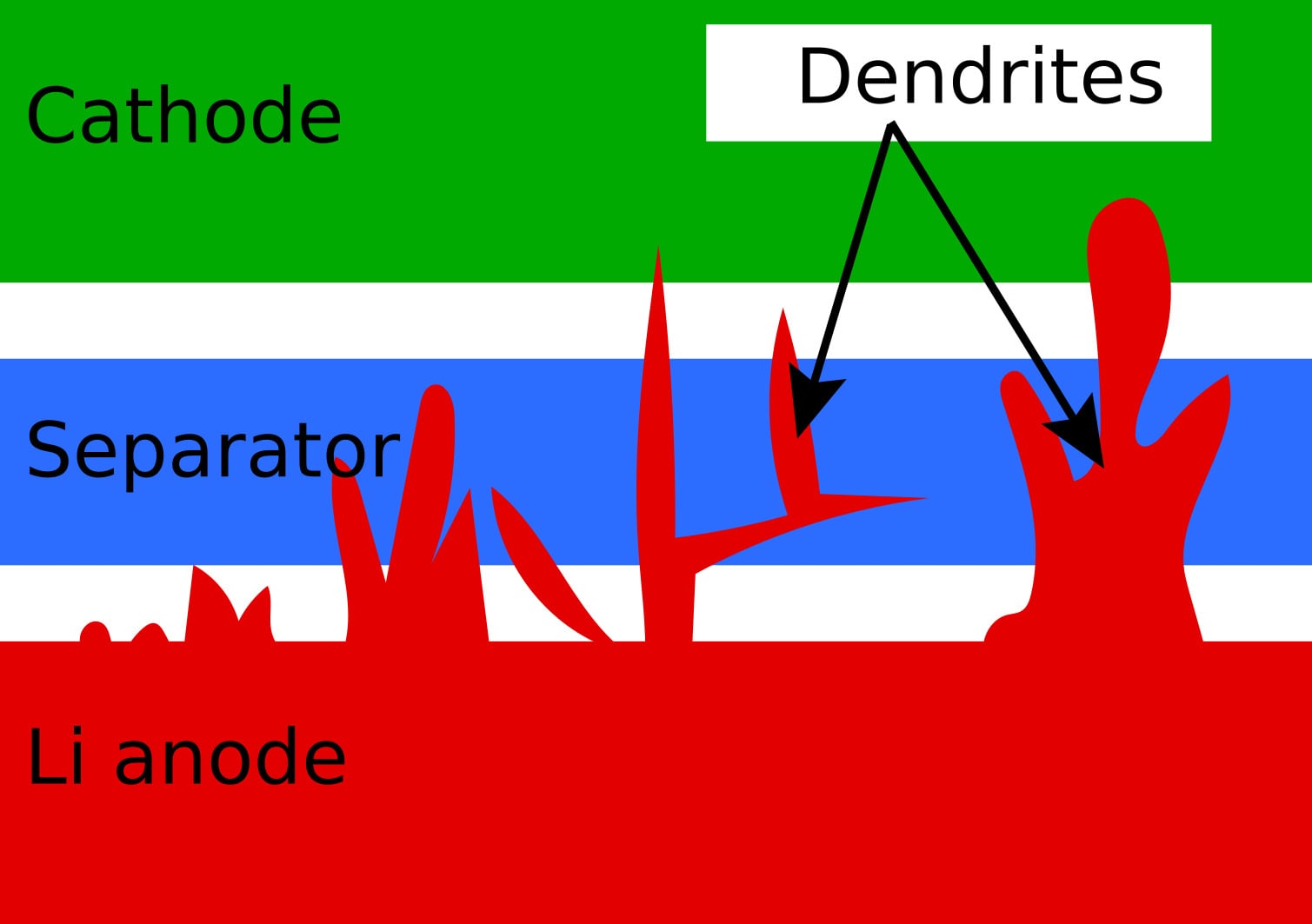Pierwsza faza polega na osadzaniu się litu w porach podpowierzchniowych za pomocą mikropęknięć. Następnie kolejne ładowania akumulatora powodują wzrost ciśnienia i powolne wydobywanie się litu z porów oraz pogłębianie się pęknięć.