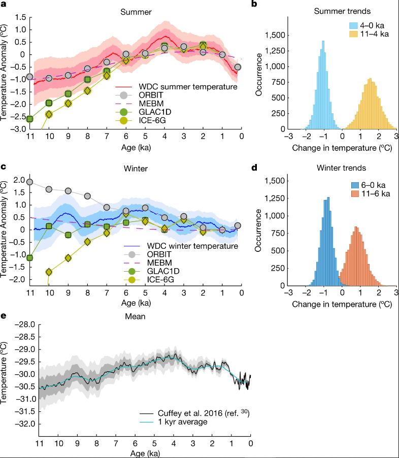 Analizy zmian stosunków izotopów ukazały, że najcieplej w ciągu holocenu było na Antarktydzie Zachodniej 4100 lat temu. Od tamtego momentu temperatury letnie ciągle spadają, chociaż zimowe wartości pozostają przez cały holocen bez większych odchyleń. Wynik ten sugeruje, że zmiany temperatur letnich mogą wynikać ze zmian intensywności nasłonecznienia, a te mogą właśnie być implikowane cyklami Milankovicia.