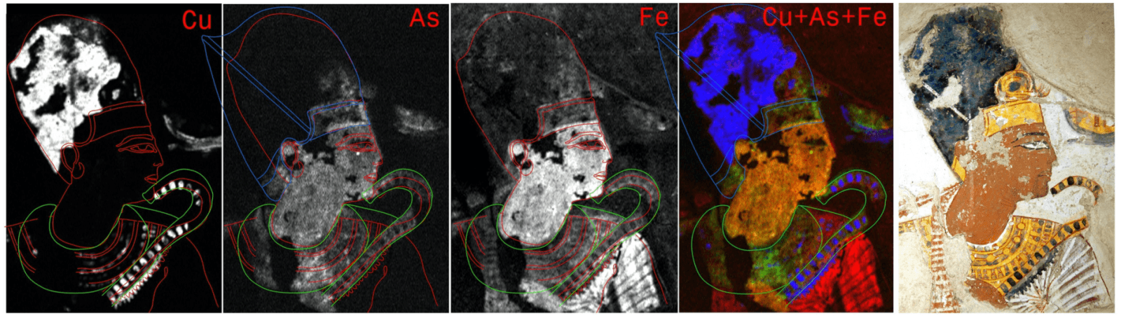 Przedmiotem badań były malowidła naścienne w jednym z grobowców w Tebach, datowanym na okres Ramessydów. Analizowano dwa konkretne przedstawienia – ramienia oraz głowy Ramzesa II wraz z koroną. Metodą, jaką zastosowano, było mapowanie za pomocą makro rentgenowskiego obrazowania fluorescencyjnego (XRF).