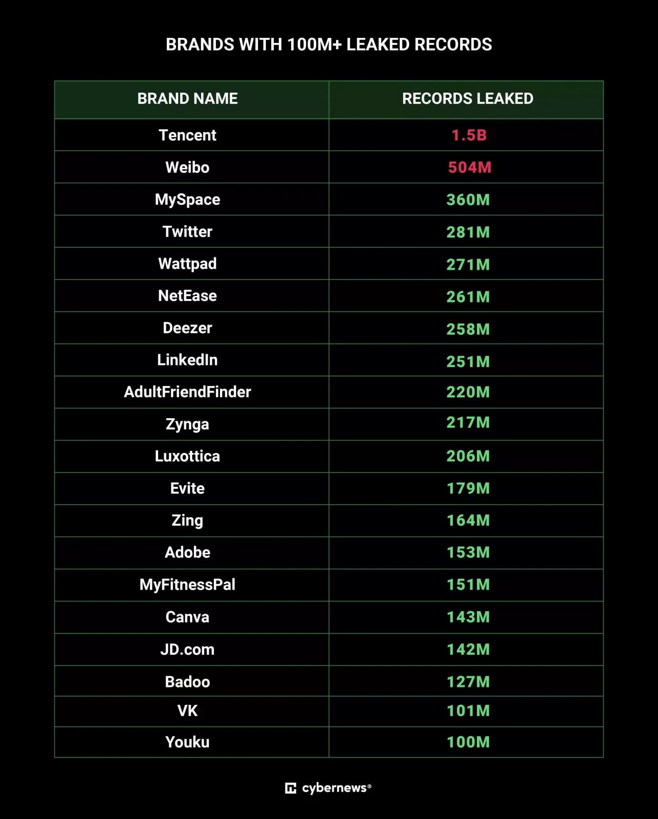 MOAB to gigantyczna baza danych stworzona z mniejszych baz danych, a dzięki wspomnianym folderom specjaliści zdołali wykryć wycieki, o których wcześniej… nie mieli pojęcia. Najwięcej danych wyciekło z chińskich serwisów Tencent oraz Weibo – odpowiednio 1,5 mld oraz 504 mln. Na trzecim miejscu znalazła się platforma MySpace, która czasy świetności miała lata temu, a obecnie mało kto z niej korzysta – dzięki czemu łatwo zdobyć stare hasła. Zestawienie stron, z których skradziono najwięcej danych, prezentuje się następująco: