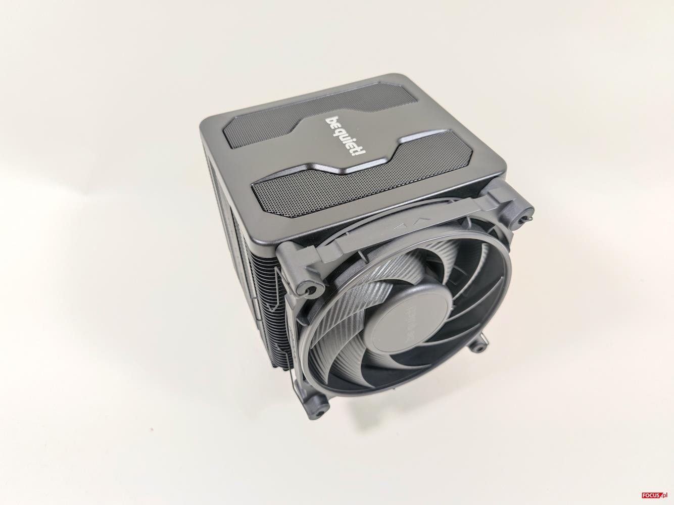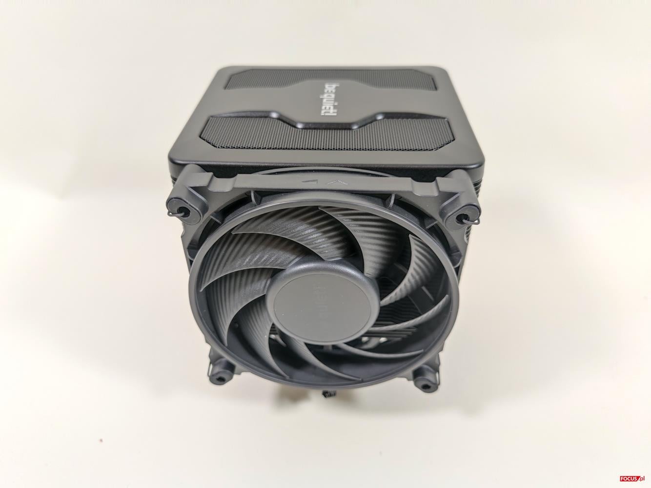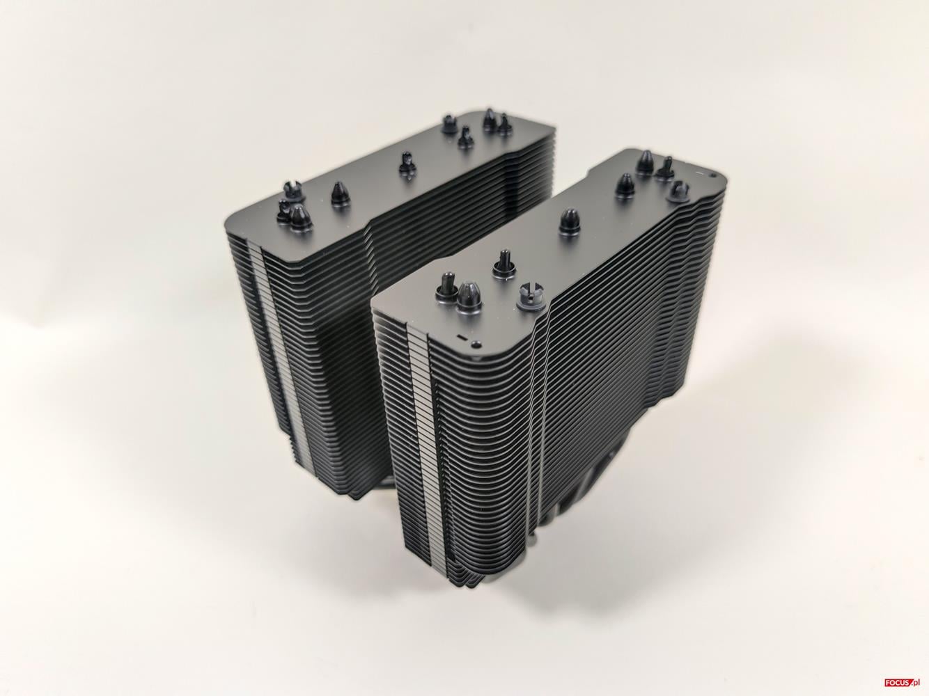 Za chłodzenie odpowiada siedem 6 mm ciepłowodów. Obie wieże są wyłożone powłoką z cząsteczkami ceramicznymi. Wraz z ciepłowodami są po prostu czarne, co dobrze wygląda. Finy są dosyć grube, nie wyginają się i są naprawdę dobrej jakości. Podstawka jest niklowana, dzięki czemu możecie użyć pasty termoprzewodzącej na bazie ciekłego metalu. Na górze mamy nakładkę mocowaną na magnes. Pod jej zdjęciu jest dostęp do środkowego wentylatora oraz do przełącznika trybów pracy: P i Q.