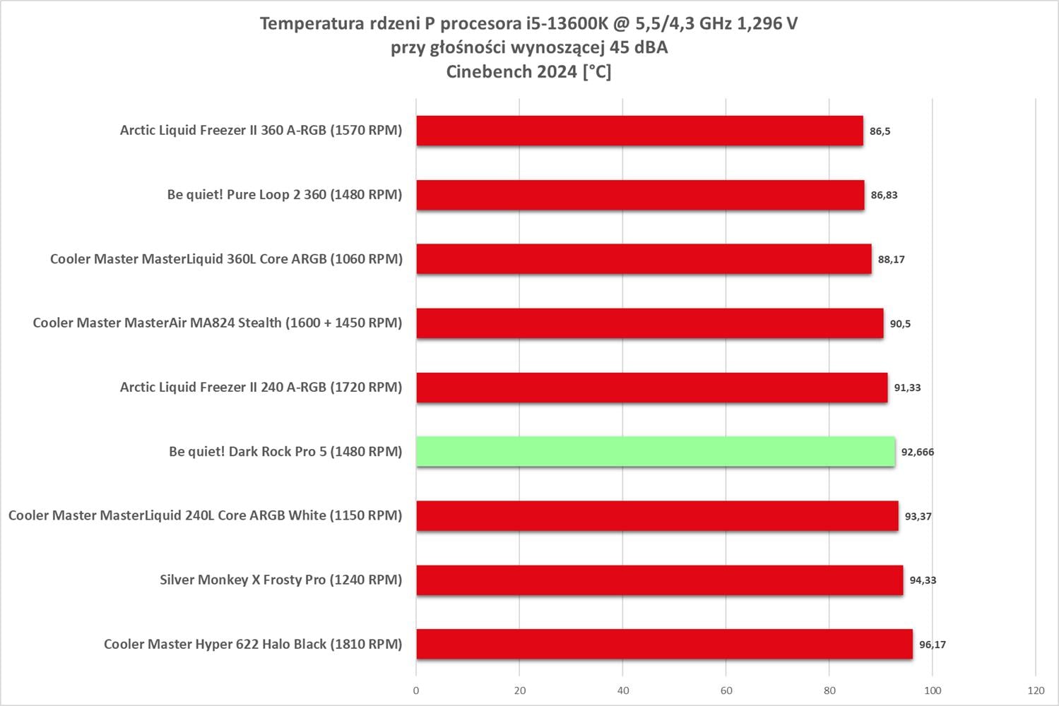 Po normalizacji do 45 dBA widać przewagę nad Frosty Pro i to jest spory plus konstrukcji be quiet!. Tutaj tak naprawdę chłodzenie wypada już bardzo dobrze i nie można jemu nic zarzucić.