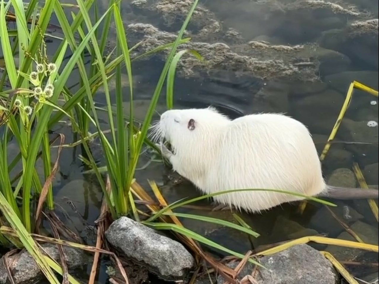 Choć nutria jest biała, prawdopodobnie nie jest to albinos, a po prostu osobnik o białej sierści (niealbinotyczny). Można to stwierdzić po tęczówkach, które nie są czerwone (jak u albinosów), a niebiesko-czarne, jak u barwnych zwierząt.